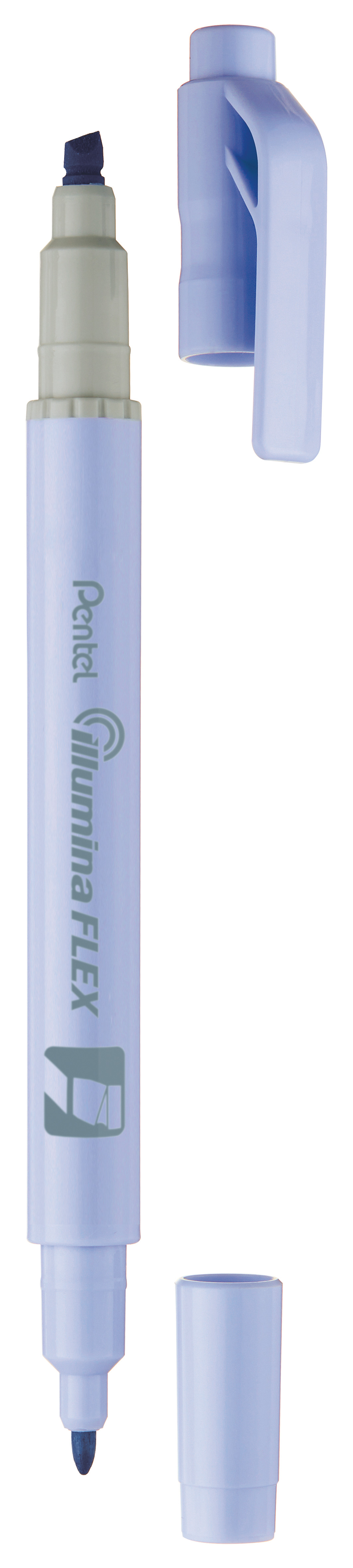 Pastell-Leuchtstift Illumina Flex, mit zwei unterschiedlichen Spitzen: 1 breiter, flexibler Schreibkopf für weiche Untergründe (z.B. Buchseiten), Strichbreiten von 1.5 - 3.5mm und 1 feine Rundspitze zum Highlighten und Schreiben, Stichbreite 1mm.
