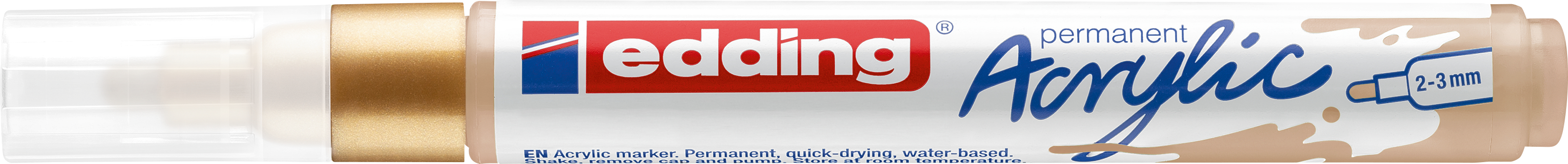 Acrylmarker zum Malen auf hellen oder dunklen Oberflächen, ideal für Materialien wie Leinwand oder Malpapier. Die Rundspitze hat eine Strichstärke von 2 - 3 mm. Die hochwertige pigmentierte Acrylfarbe auf Wasserbasis ist deckend, lichtbeständig, geruchsarm und nach dem Trocknen permanent. In 26 verschiedenen Farben erhältlich. Die Farben sind perfekt auf die Farbpalette der edding 5200 Permanentsprays abgestimmt. Geeignete Ersatzspitzen (edding 5100 Ersatzspitzen) sind erhältlich.
