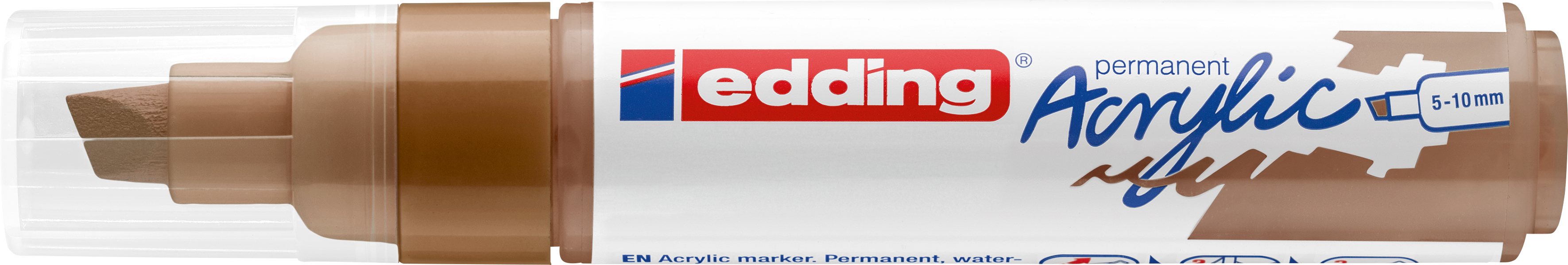 Acrylmarker zum Malen auf hellen oder dunklen Oberflächen, ideal für Materialien wie Leinwand oder Malpapier. Die Keilspitze hat eine Strichbreite von 5-10 mm. Die hochwertige pigmentierte Acrylfarbe auf Wasserbasis ist deckend, lichtbeständig, geruchsarm und nach dem Trocknen permanent. In 26 verschiedenen Farben erhältlich. Die Farben sind perfekt auf die Farbpalette der edding 5200 Permanentsprays abgestimmt. Geeignete Ersatzspitzen (edding 5000 Ersatzspitzen) sind erhältlich.