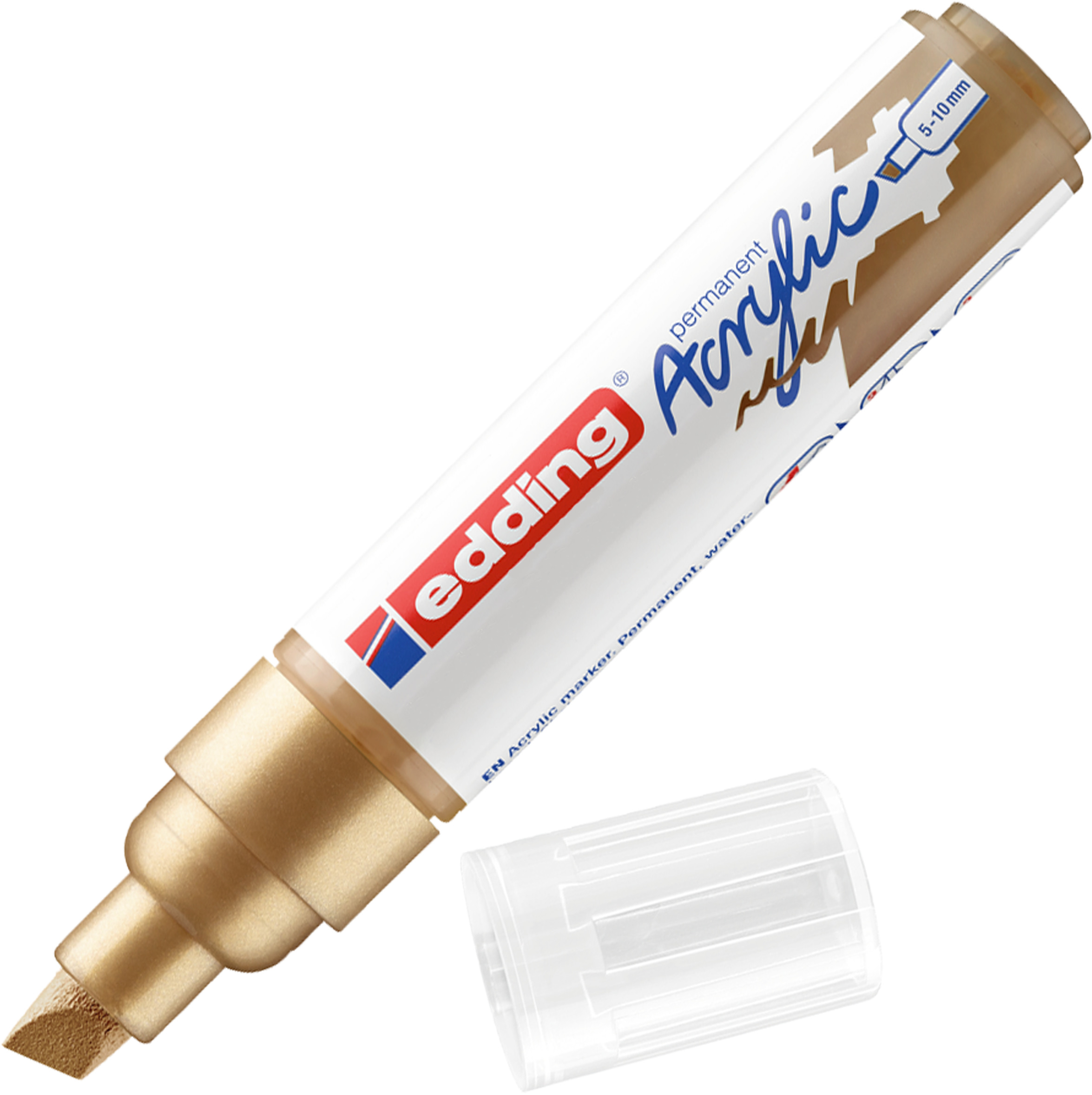 Acrylmarker zum Malen auf hellen oder dunklen Oberflächen, ideal für Materialien wie Leinwand oder Malpapier. Die Keilspitze hat eine Strichbreite von 5-10 mm. Die hochwertige pigmentierte Acrylfarbe auf Wasserbasis ist deckend, lichtbeständig, geruchsarm und nach dem Trocknen permanent. In 26 verschiedenen Farben erhältlich. Die Farben sind perfekt auf die Farbpalette der edding 5200 Permanentsprays abgestimmt. Geeignete Ersatzspitzen (edding 5000 Ersatzspitzen) sind erhältlich.