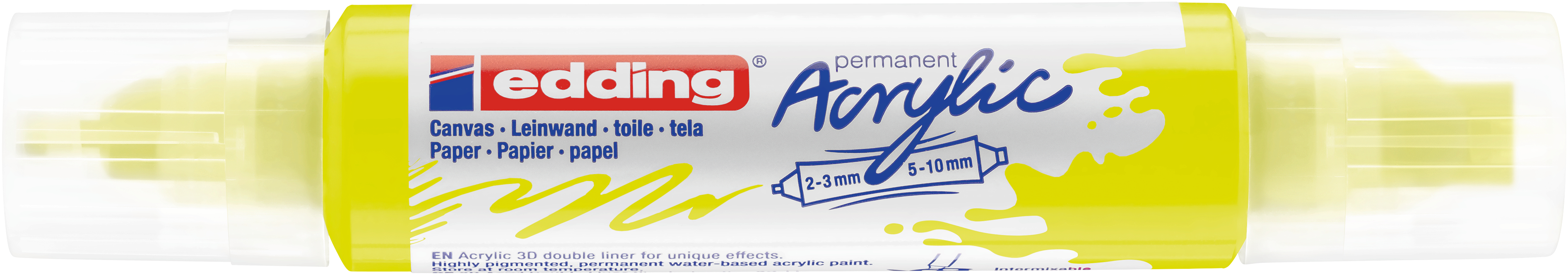 Acryl 3D Double Liner für einzigartige Effekte beim Malen auf hellen oder dunklen Oberflächen, ideal für Materialien wie Leinwand oder Malpapier. Die Tube hat an jedem Ende eine Aufsatz mit einer Strichbreite von 2-3 mm bzw. 5-10 mm. Die hochwertige pigmentierte Acrylfarbe auf Wasserbasis ist deckend, lichtbeständig, geruchsarm und nach dem Trocknen permanent. In 26 verschiedenen Farben erhältlich. Die Farben können einzeln verwendet oder miteinander gemischt werden. Die Farben sind perfekt auf die Farbpalette der edding 5200 Permanentsprays abgestimmt.