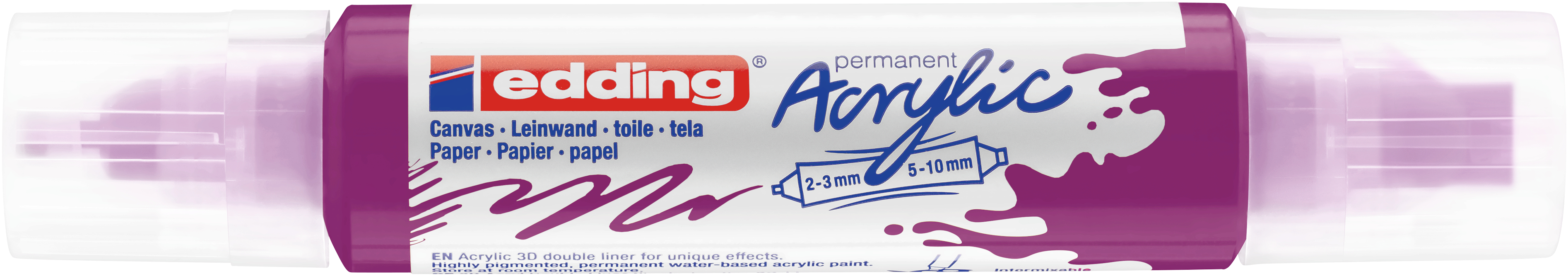 Acryl 3D Double Liner für einzigartige Effekte beim Malen auf hellen oder dunklen Oberflächen, ideal für Materialien wie Leinwand oder Malpapier. Die Tube hat an jedem Ende eine Aufsatz mit einer Strichbreite von 2-3 mm bzw. 5-10 mm. Die hochwertige pigmentierte Acrylfarbe auf Wasserbasis ist deckend, lichtbeständig, geruchsarm und nach dem Trocknen permanent. In 26 verschiedenen Farben erhältlich. Die Farben können einzeln verwendet oder miteinander gemischt werden. Die Farben sind perfekt auf die Farbpalette der edding 5200 Permanentsprays abgestimmt.