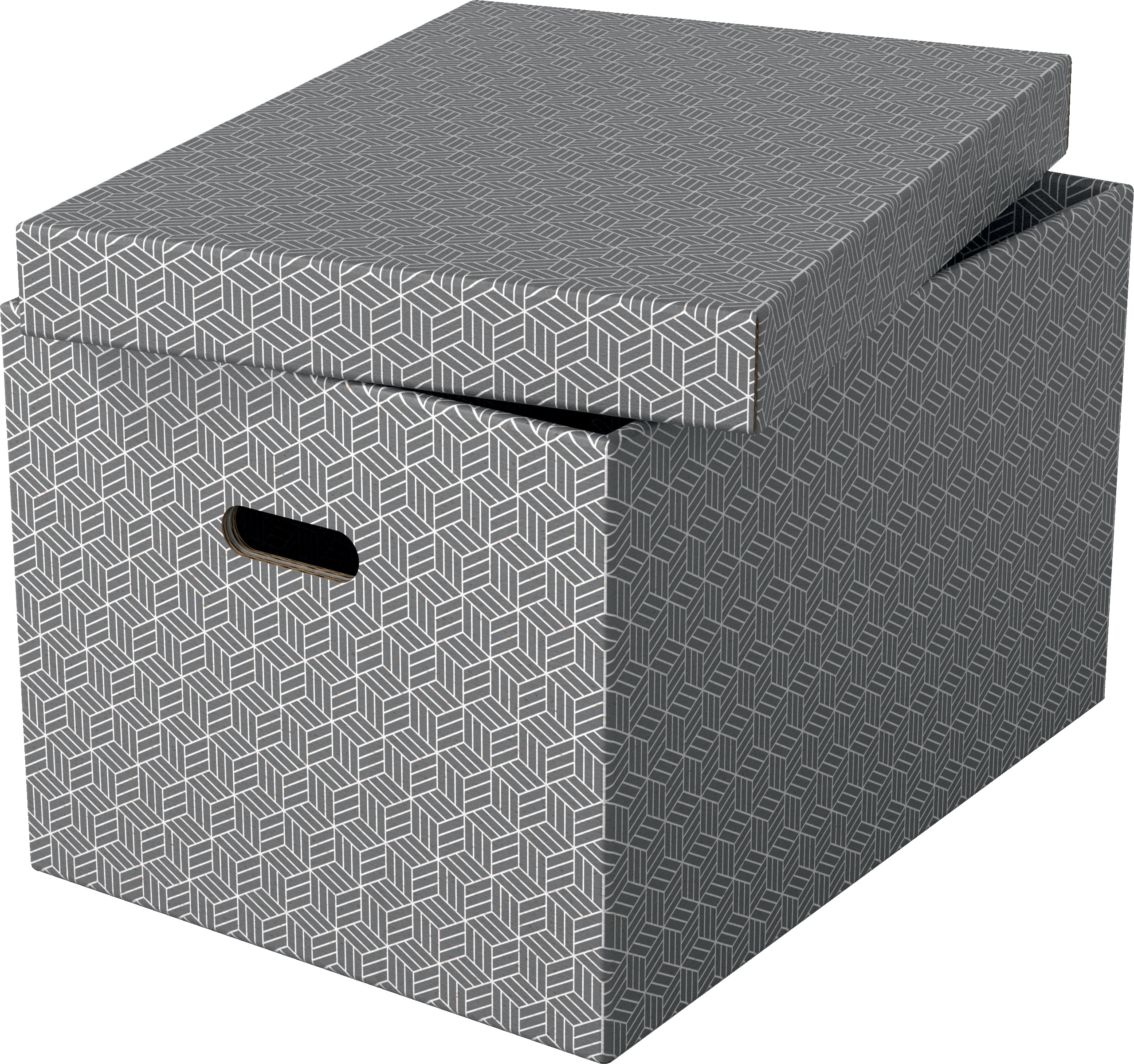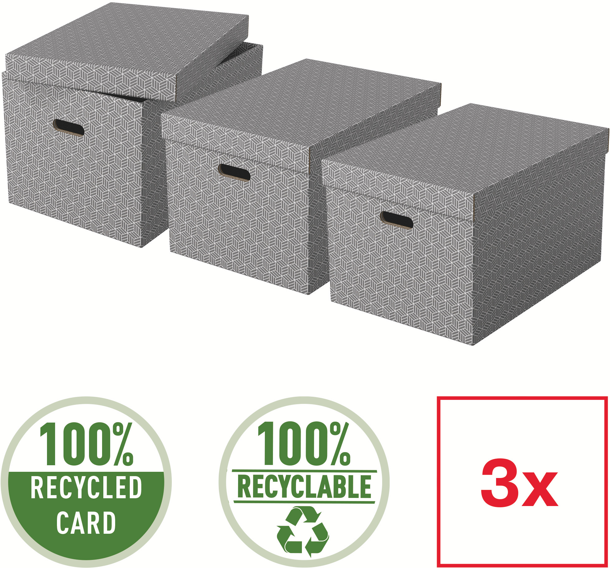 Elegante und moderne Aufbewahrungsboxen aus Wellpappe mit abnehmbarem Deckel, ideal zum Verpacken von Geschenken oder zum schnellen Verstauen von Utensilien zu Hause. Set mit drei Boxen der gleichen Grösse, zur Aufbewahrung in Regalen oder in kubischen, offenen Möbeln, um kleinere Gegenstände wie Fotos und persönliche Dokumente ordentlich und leicht auffindbar aufzubewahren. Mit etwas Geschenkband können Sie mit diesen Boxen auch ein Geschenk verpacken! Nach dem Öffnen kann die Box dann vom Empfänger für die Aufbewahrung zu Hause wiederverwendet werden und bietet somit 2 Geschenke in einem. Hergestellt aus stabiler, 100 % recycelter und 100 % recycelbarer FSC-zertifizierter Wellpappe. Die abwischbare Oberfläche ist mit einem zweifarbigen, geometrischen Design versehen, um Ihrer Aufbewahrung Stil zu verleihen. Wird flach verpackt geliefert und lässt sich schnell und einfach aufbauen. Die robuste Konstruktion mit doppelten Seitenwänden und Boden sorgt für Stabilität und Langlebigkeit.