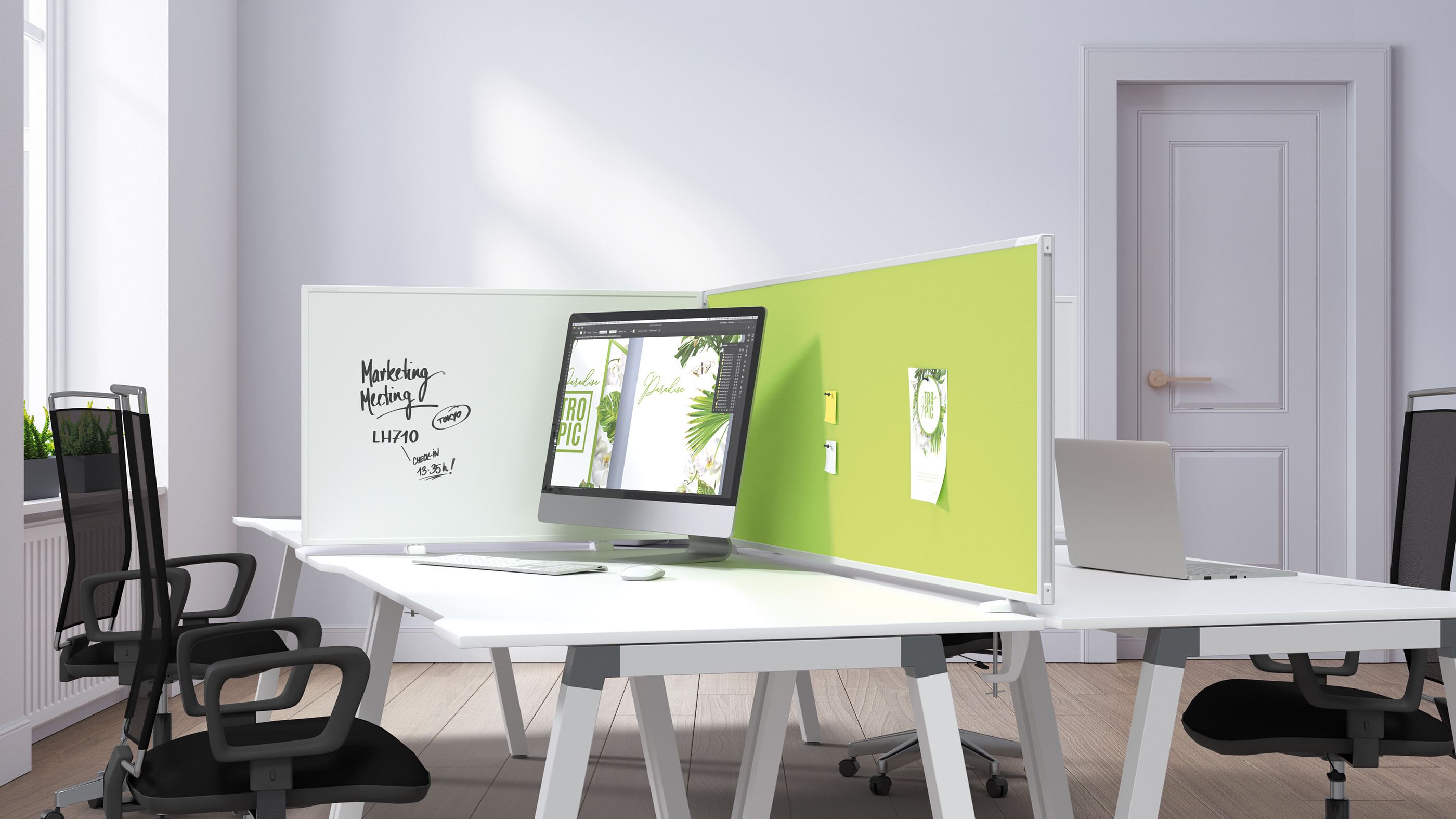 Innovative Tischtrennwände für Team-Arbeitsplätze, fördern die Kommunikation und sorgen gleichzeitig für mehr Privatsphäre. Sie trennen Arbeitsplätze optisch voneinander ab und bieten ausserdem doppelseitige Organisationsflächen: