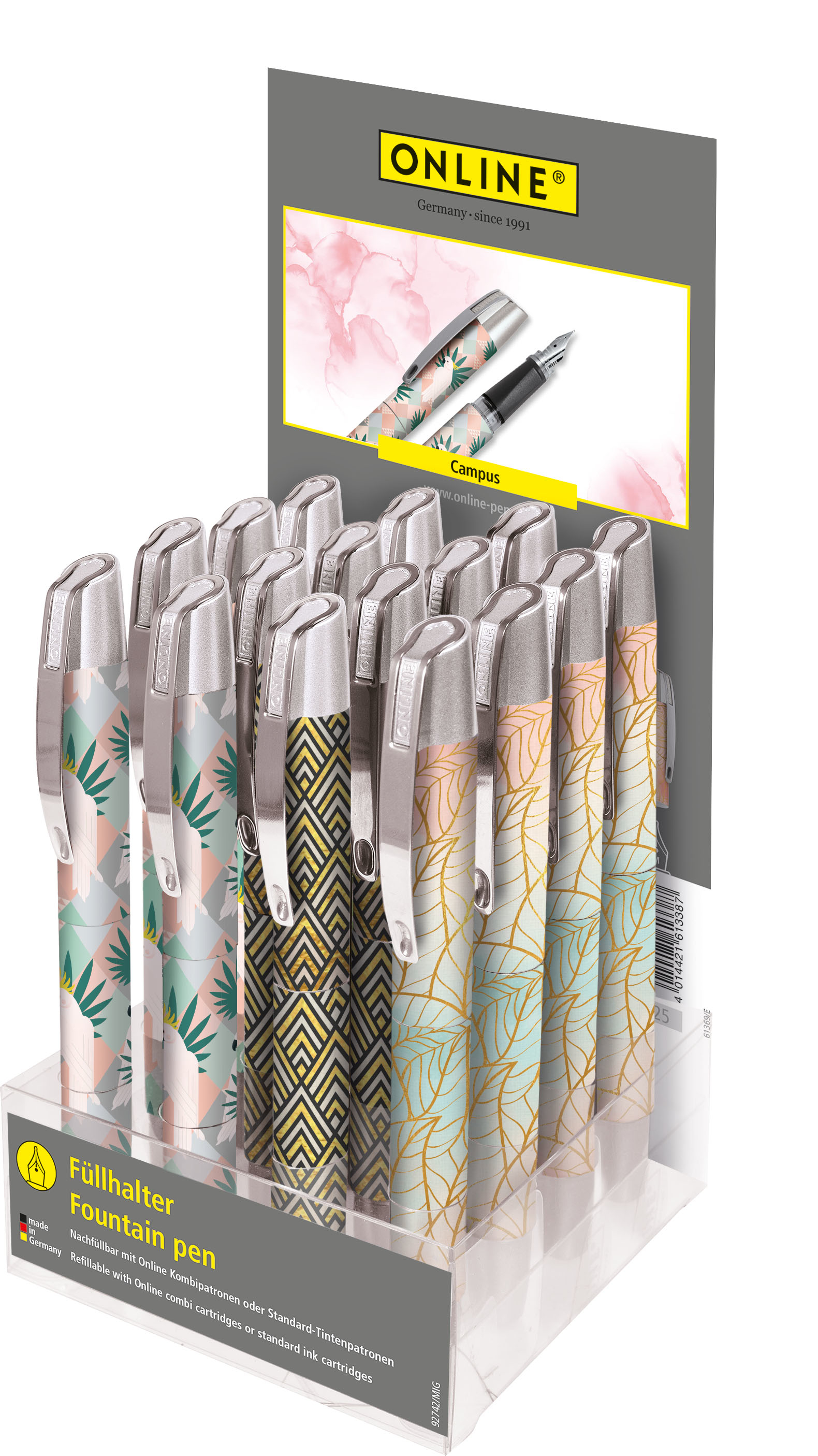 Modernes Design mit Top-Qualität für höchste Ansprüche. Edle Details, robuste Ausführung, trendige Designs! Dank des ergonomischen Softtouch-Griffstückes entstehen ein entspanntes Schreibgefühl und ein Top-Feeling am Schaft, selbst bei extremem Dauereinsatz. Wichtig für alle Allergiker: Der neue, garantiert nickelfreie Clip aus purem Edelstahl. Der neue Campus Füllhalter ist mit hochwertiger Iridiumfeder M (mittel) ausgestattet. Nachfüllbar mit ONLINE-Kombipatronen oder Standard-Tintenpatronen. Stück für Stück geprüfte Qualität - Made in Germany. Display, 12 Stück.