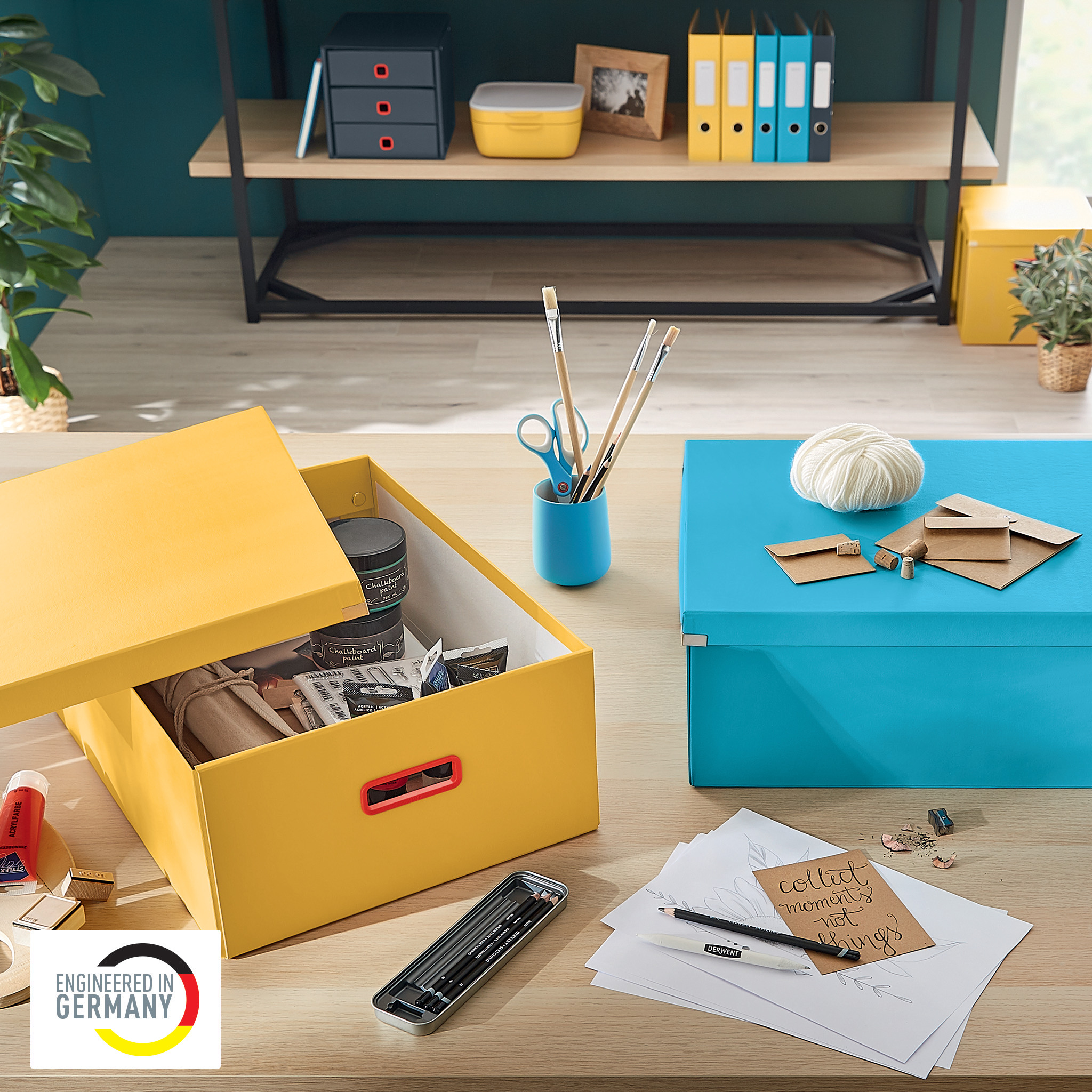• Lieferumfang: 1 x Leitz Click & Store Aufbewahrungs- und Transportbox A3, Abmessungen (B x H x T): 369 x 200 x 482 mm, 1280 g, Warmes Gelb, Cosy Serie, Kartonverpackung, 53490019