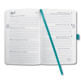 Der Wochenkalender Jolie im Hardcover-Einband aus weichem PU-Material mit geprägtem Design enthält 174 Seiten, inklusive Notizseiten (12 Blatt perforiert zum Heraustrennen). Das Kalendarium zeigt je eine Woche auf einer Doppelseite. Zusätzlich enthält der Kalender umfangreiche Infoseiten, z. B. Monats- und Jahresübersichten, internationale Kleidergrössen, Stunden- und Familienplaner, Platz für Adressen, Feiertage, Ferienübersichten u.v.m. Jetzt mit Stickerbogen zum Organiseren & Individualisieren. Ein Monatsregister am Seitenrand ermöglicht das schnelle Auffinden der Monate. Der Kalender hat einen farblich abgestimmten Gummibandverschluss und ist mit Stiftschlaufe, einem Leseband und einer Einstecktasche ausgestattet.