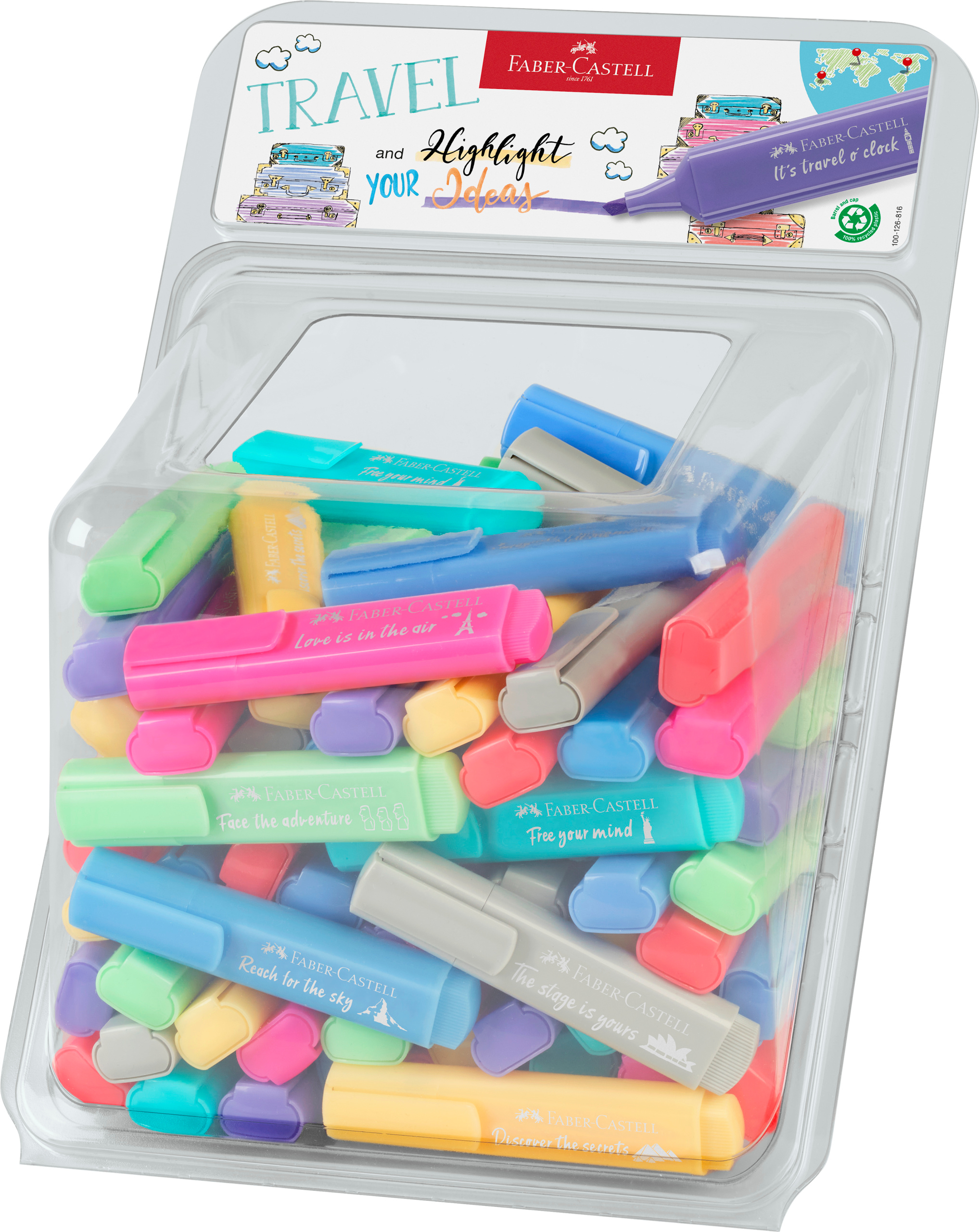Highlight your ideas - Mit fantasievollen Reisemotiven;Kappe und Schaft zu 100% aus recyceltem Kunststoff; Tinte auf Wasserbasis; 3 verschiedene Strichstärken 1, 2 und 5 mm; Langlebige Keilspitze; Ideal für alle gängigen Papiere; Hohe Markierleistung mit gleichmässiger Farbabgabe; Diese Produkte sind ausschliesslich im Display verfügbar - nicht einzeln nachbestellbar!