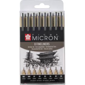 Eine Auswahl der 8 beliebtesten, schwarzen Pigma Micron-Stifte in verschiedenen Spitzenbreiten: 1 x 003 (0,15 mm), 1 x 005 (0,2 mm), 1 x 01 (0,25 mm), 1 x 02 (0,30 mm), 1 x 03 (0,35 mm), 1 x 04 (0,40 mm) 1 x 05 (0,45 mm), 1 x 08 (0,50 mm). Er ist darüber hinaus der empfohlene Stift zum Zentangle-Zeichnen. Dank der feinen Spitze ist dieser Stift ideal für sowohl technische als auch künstlerische Zeichnungen. Die einzigartige Sakura Pigma™-Tinte drückt nicht durch das Papier, ist dauerhaft, wasserfest, lichtbeständig, schnell trocknend und pH-neutral.