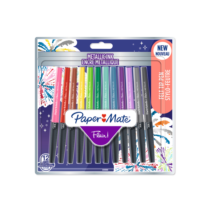 PaperMate Flair Metallic Klassisch elegantes Flair-Design, der Schaft zeigt die Schreibfarbe an. Leuchtende Farbbrillanz und die Metallic-Tinte – glitzert auf weissem Papier. Die Tinte in verschiedene Metallic-Farben ist auf Wasserbasis – kein Verschmieren, kein Klecksen, kein Aussetzen, drückt nicht durch´s Papier. Die Kappe verhindert das Wegrollen & schützt vor dem Austrocknen und Unterstütz die richtige Lagerung mit der Spitze nach unten.