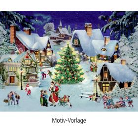 Mit farbig finkelnden und glow-in-th-dark Diamantsteinchen. Winzige Diamantsteine werden mithilfe eines Stifts auf eine selbsthaftende, vorgedruckte Motivvorlage aufgebracht. Nach 24 Tagen erstrahlt ein grosses funkelndes Weihnachtsbild.
