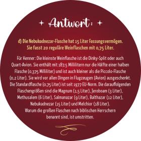 In Wein liegt die Wahrheit – der perfekte Adventsbegleiter für alle, die guten Wein lieben!Um Weinskandale, Rappern und Kirchenfenster dreht sich das witzige Quiz – herrlich unnützes, aber unterhaltsames Wissen für jeden Tag im Advent.Garantierter Rätselspass: 24 Fragen und Antworten rund um die Geschichte der edlen Tropfen, um Anbaugebiete, Herstellung, Sorten und Fun FactsSchön verstaut: In der attraktiven Geschenkdose sind die 24 runden Karten immer gut geschützt und stets einsatzbereit. Die hübsche Metalldose kann man wiederverwenden und als Geschenkverpackung nutzenTolle Geschenkidee: Ideales Mitbringsel für jede:n Weinschmecker:in: Freund, Schwester, Vater, Opa, Partnerin, Lieblingsmensch oder alle anderen, die sich eine kleine kulinarische Pause vom Weihnachtstrubel gönnen möchten.Na dann, Prost! Denn schon Goethe schrieb: Das Leben ist viel zu kurz um schlechten Wein zu trinken.