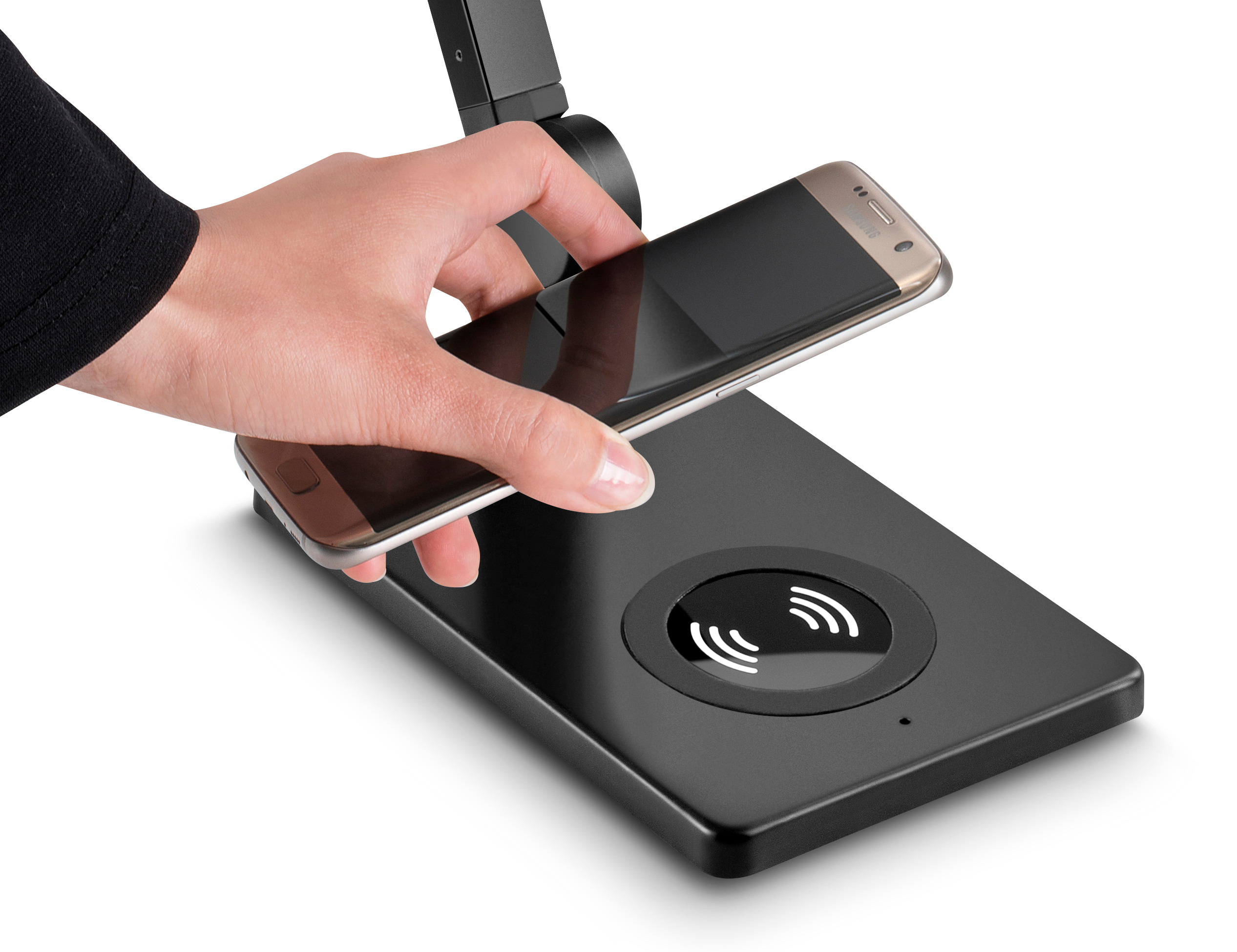 LED-Lampe mit kabelloser Ladestation, sehr robust (Metallstruktur) und extrem leistungsstark (7,2 W), ausgestattet mit einem taktilen Dimmer (max. 230 lm), einem taktilen Farbdimmer (von 3000k bis 5500k) und mit einer Lebensdauer von 50 000h. Dank dieser Lampe können Sie auch 2 Smartphones gleichzeitig über einen USB-Anschluss aufladen (5V2A ultraschnelles Aufladen) sowie ein kabelloses Telefonladegerät (kompatibel mit allen Smartphones und Geräten mit dieser Technologie).