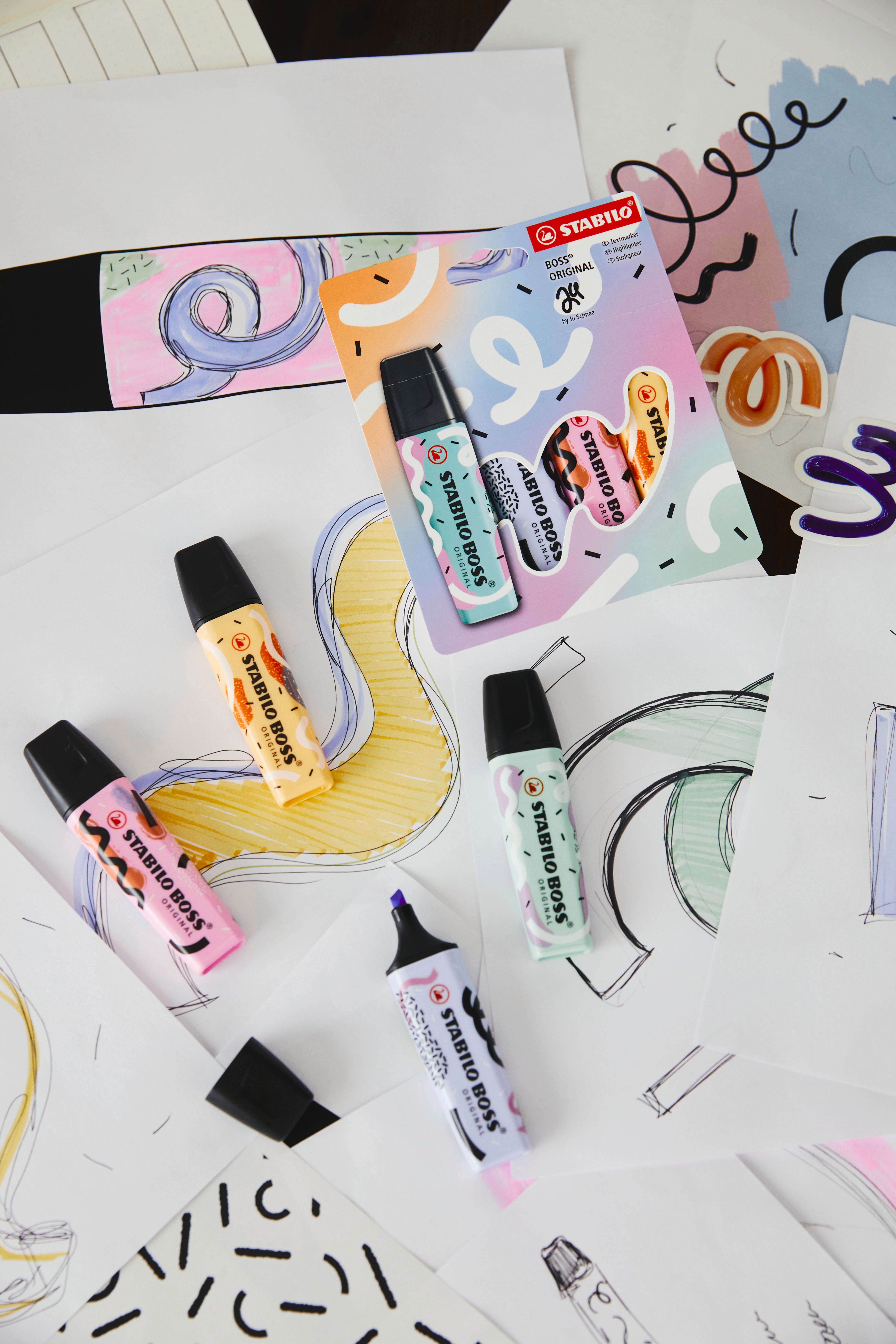 Textmarker STABILO® BOSS® ORIGINAL by Ju Schnee Die STABILO BOSS ORIGINAL by Ju Schnee Limited-Edition mit coolen Motiven von der Künstlerin Ju Schnee. Unvergleichlicher Design-Klassiker - seit 1971. Produktinformationen: - hohe STABILO-Qualität in Verarbeitung, Tinte und Schreibkomfort für professionelles Arbeiten, Hervorheben, Unterstreichen - STABILO Anti-Dry-Out Technology: 4 Stunden Austrocknungsschutz für konzentriertes Arbeiten - geruchsfreie Tinte auf Wasserbasis - 2 Strichstärken: 2 + 5 mm - flache Form verhindert Wegrollen
