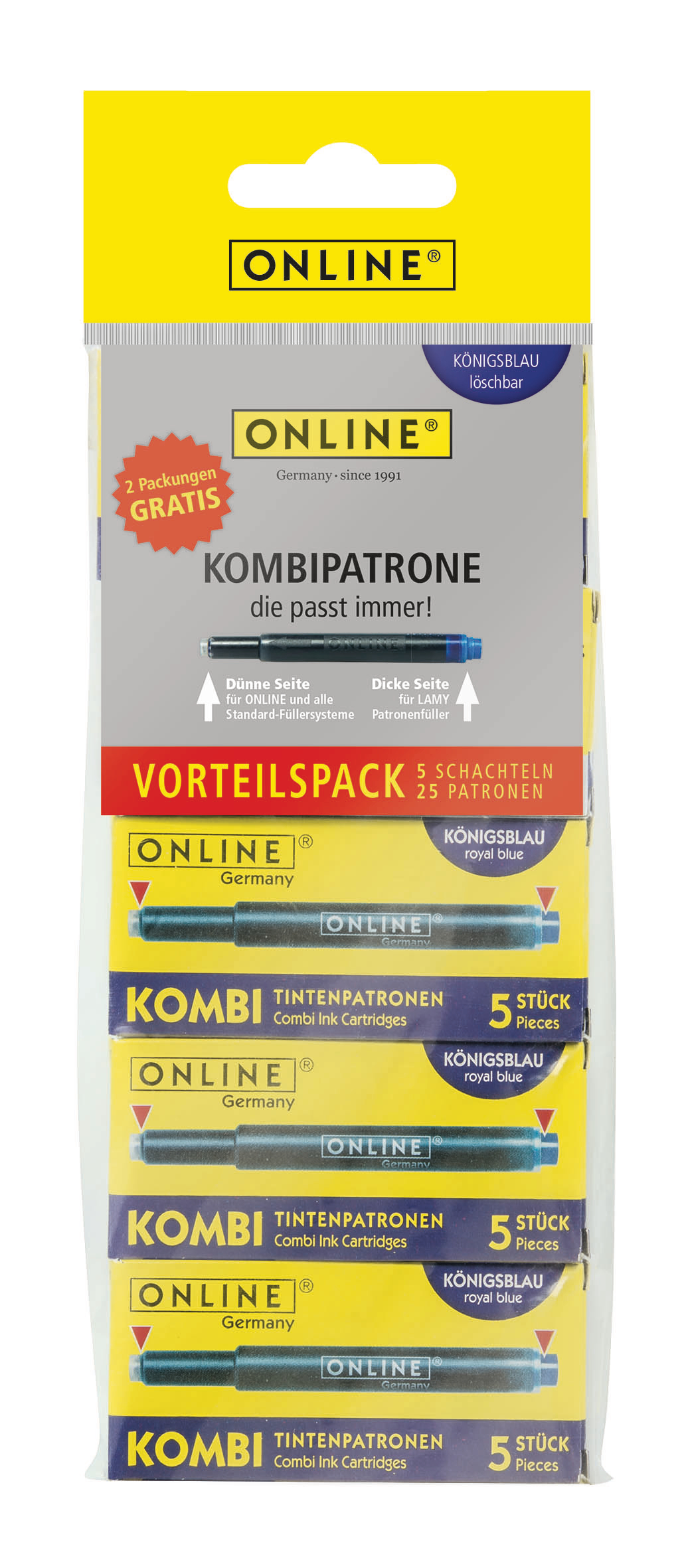 Die Kombipatrone von ONLINE – die passt immer! So kann die dünne Seite für ONLINE und alle Standard-Füllersysteme und die dicke Seite für LAMY-Patronenfüller verwendet werden. Die hochwertige Tinte garantiert intensive Schreibfarbe in gleichbleibender Qualität, in vielen, verschiedenen Schreibfarben erhältlich.