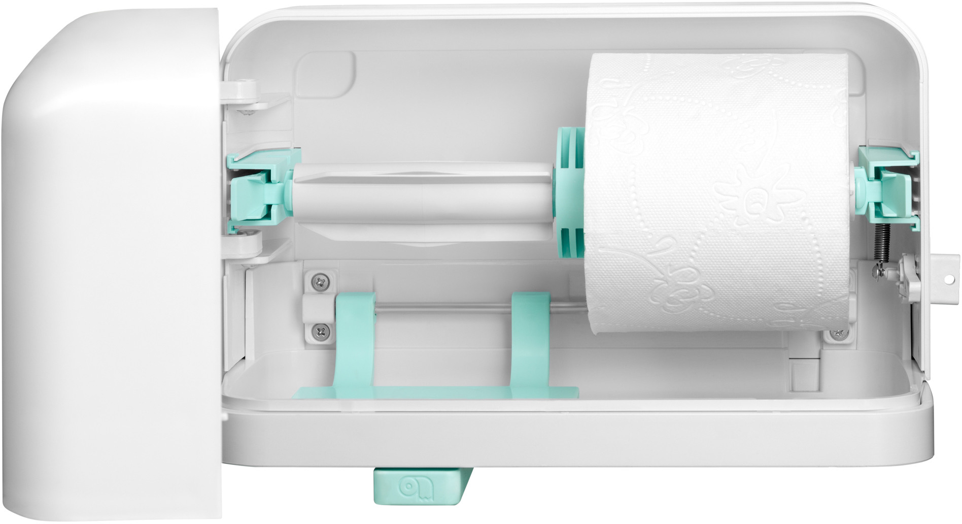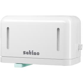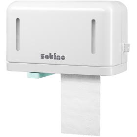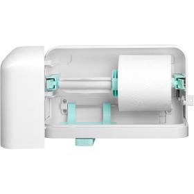 Das clevere Spendersystem für Kleinrollen: Erst nach Verbrauch der ersten Rolle wird die zweite freigegeben. Die integrierte Rollenbremse vermindert mutwilliges oder unabsichtliches Abrollen und übermässigen Papierverbrauch.