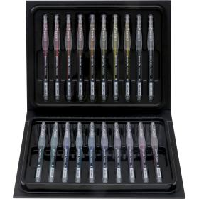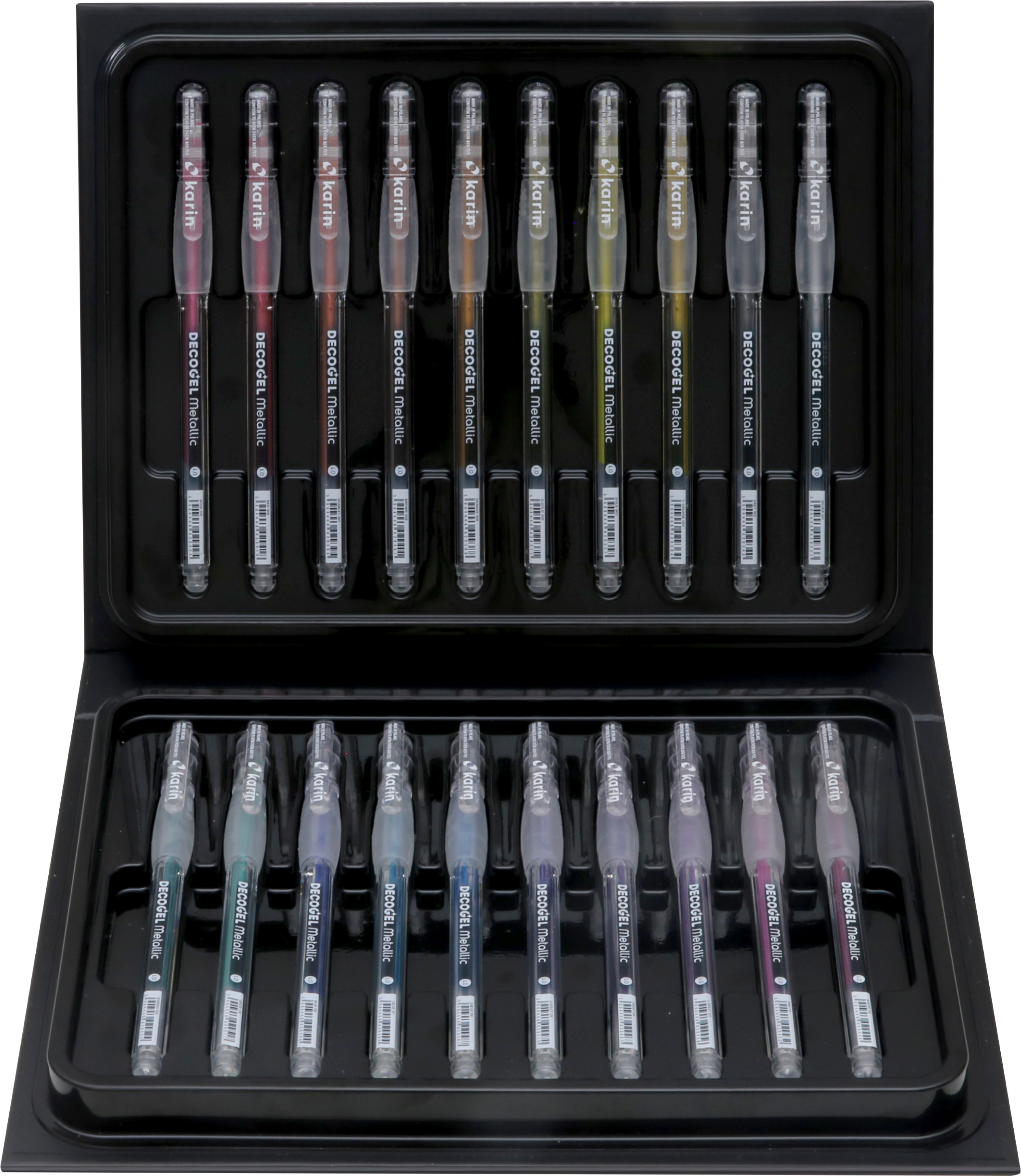 DECO GEL 1.0 ist eine Sammlung von 50 Gelstiften für Dekoration, Zeichnung und Kalligraphie, die in Farbserien unterteilt sind: MILKY WAY, METALLIC und STAR SPARKS. Sie funktionieren perfekt auf hellen und dunklen Papierflächen sowie auf mit Wasserfarben bemalten Papieren, wasserbasierten Markern (wie Brushmarker PRO Markern) und vielen anderen Oberflächen wie Glas, Folie, Metall oder Stein mit Acrylfarben und Markern, die Acrylfarben enthalten (wie Pigment Decobrush Marker). Diese Vielfalt an Oberflächen bietet unbegrenzte kreative Möglichkeiten.