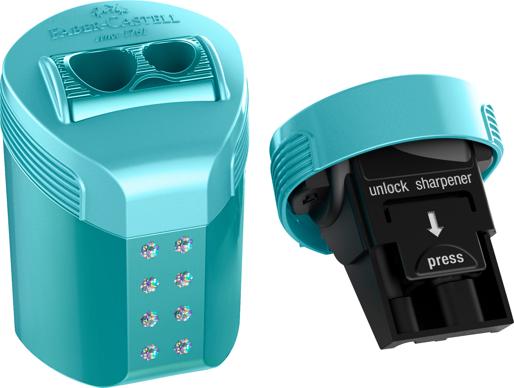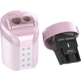 Qualitätsspitzer für leichtes und sauberes Spitzen; Rollverschluss verhindert das Herausfallen von Späneabfall; Ergonomische Form; Geeignet für Blei- und Buntstifte; Für alle gängigen Stiftformen: Standard und Jumbo; Mit Sicherheitsschraube; Farbe: ocean metallic, rose metallic, violet metallic; Aufstellkarton