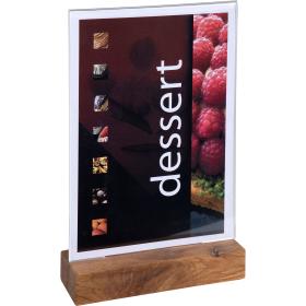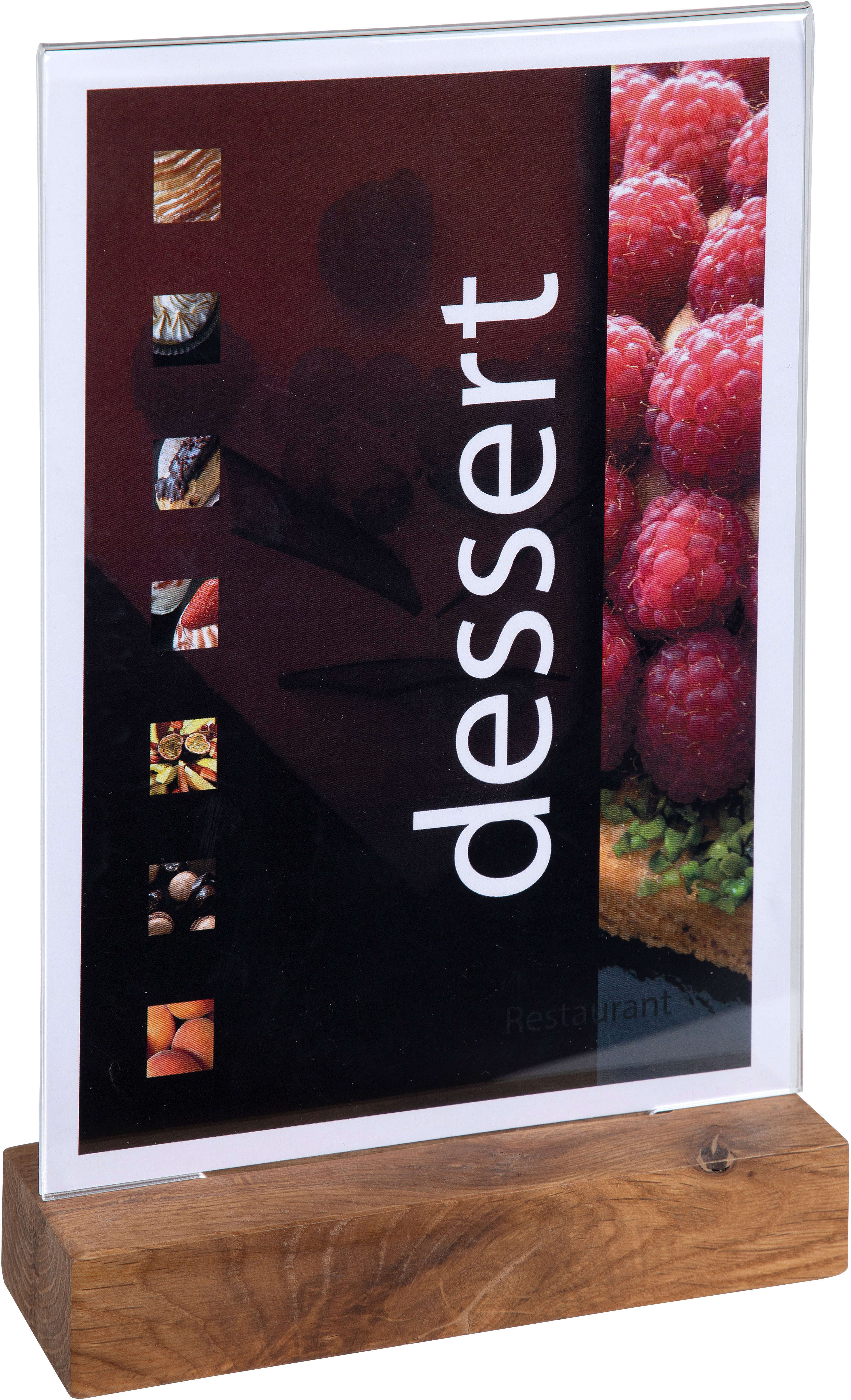 Gerader, vertikaler Tischaufsteller (in Form eines umgedrehten T). Mit einem Sockel aus massivem Eichenholz. Vorder- und rückseitig verwendbar.