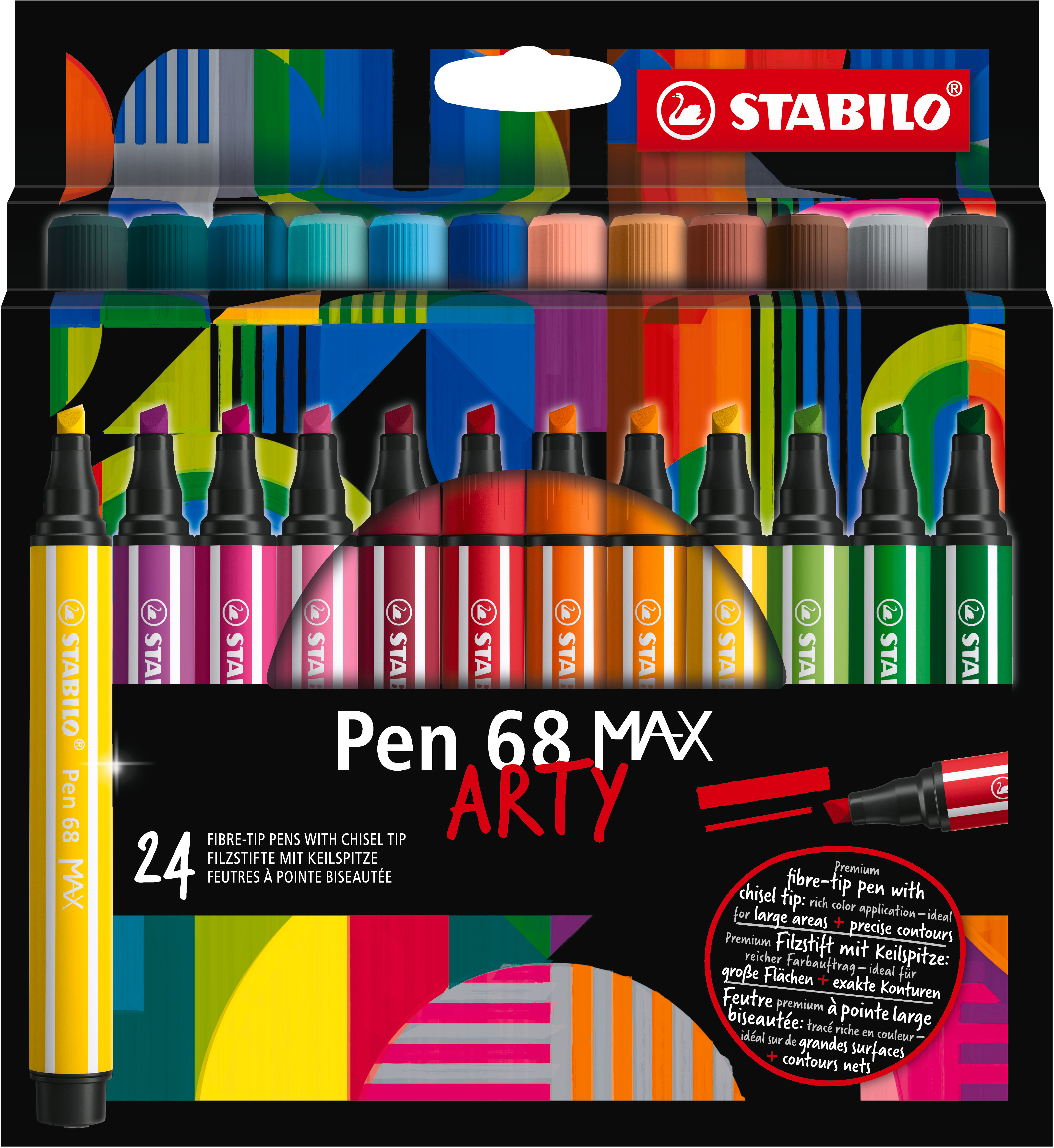 Der STABILO Pen 68 MAX ARTY ist ideal für grosse Flächen, aber auch präzise Konturen. Die Tinte auf Wasserbasis, ermöglicht Aquarellieren und Verblendungen. Die 24 Farben haben eine hohe Farbbrillanz und Leuchtkraft, für kräftige Linien und deckende Flächen.