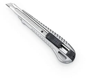 Profi Cuttermesser mit Metallgehäuse und 9 mm Klinge. Formschöne Cutter für saubere Schnittflächen und glatte Kanten. Das vielseitige Werkzeug für den Profi. Die Standard-Abbrechklinge, aus rostfreiem Stahl, kann mittels Rasterautomatik vorgeschoben werden. Die Metallführung der Schneidklinge sorgt für Sicherheit im Handling und garantiert einen exakten Schnitt. Eine Abbrechhilfe ist im Verschlussteil der hinteren Messerzuführung integriert. Ergonomisch geformter Griff aus Metall mit Rippenstruktur für sicheren Halt. Lieferung mit eingesetzter Klinge auf SB-Karte