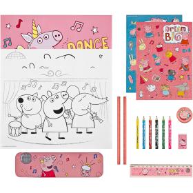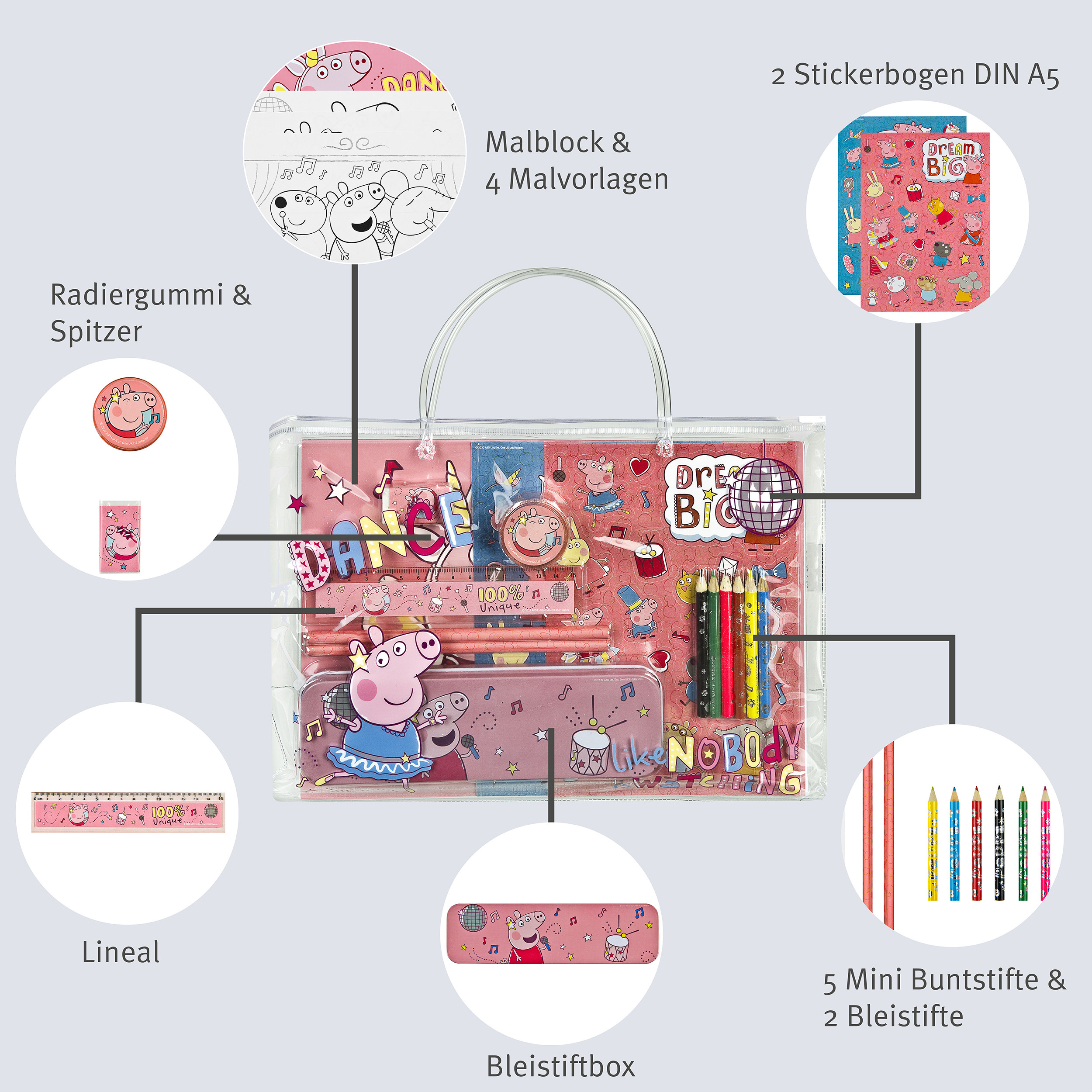Tasche mit Griff und Reissverschluss Inhalt: Metalldose, 6 Poster, 2 Stickerblätter, 2 Bleistifte, 5 Mini Buntstifte, Notizblock, Lineal, Spitzer, Radierer