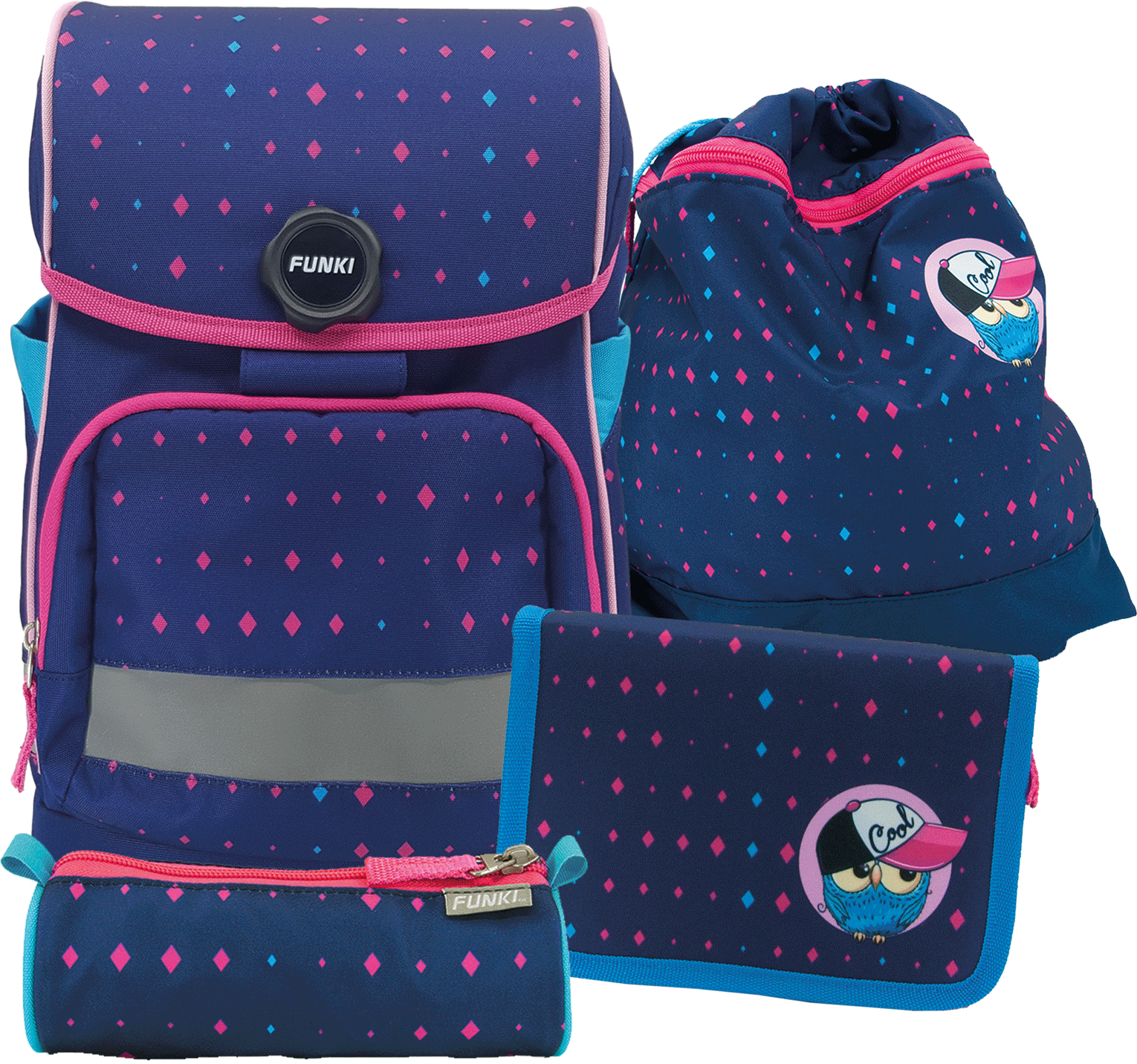 Der CUBY-Bag ist im fünfteiligen Set erhältlich, bestehend aus Schulrucksack, Schüleretui, Turnsack und Rundbeutel.. Der Regenschutz ist im Set mit dabei, damit alles auch bei Regen schön trocken bleibt.