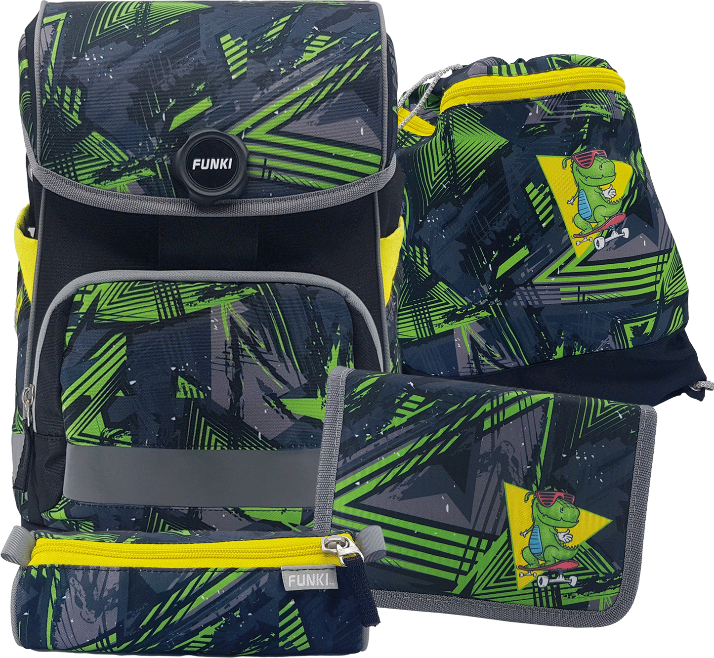 Der CUBY-Bag ist im fünfteiligen Set erhältlich, bestehend aus Schulrucksack, Schüleretui, Turnsack und Rundbeutel.. Der Regenschutz ist im Set mit dabei, damit alles auch bei Regen schön trocken bleibt.