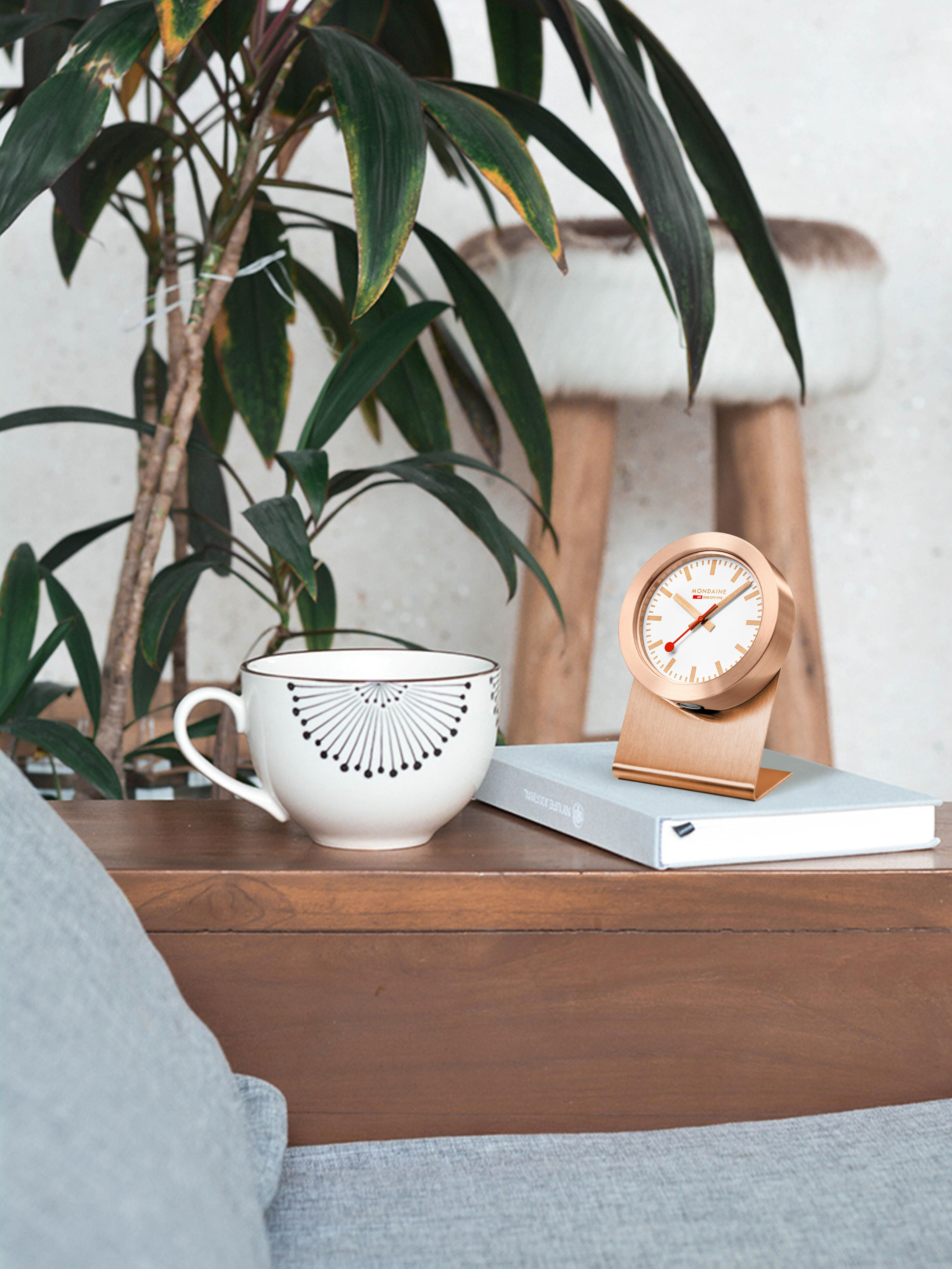 Der Klassiker am Kühlschrank. Diese ikonische Uhr kann dank ihres integrierten Magneten an einem Kühlschrank in der Küche oder einem Schrank im Büro befestigt werden. Alternativ kann sie mit dem dazugehörigen Ständer auf einen Tisch gestellt werden. Das Gehäuse aus Aluminium glänzt in einem matt gebürsteten Kupfer-Finish. Die Ton-in-Ton-Zeiger und Indexe sowie das Zifferblatt mit dem markanten, roten Sekundenzeiger unterstreichen das zeitlose Design dieser Uhr.TISCHUHREN KOLLEKTIONEinfallsreichtum und Schlichtheit sind die Elemente, die ein attraktives Designstück oft von einem wirklich ikonischen Designklassiker unterscheiden. Seit mehr als 60 Jahren folgen wir einer einfachen Idee: Form und Funktion in perfekter Harmonie. Mit unserer klassischen Kollektion konzentrieren wir uns auf das Wesentliche und verbinden edles und zeitloses Schweizer Design mit Innovation, hoher Handwerkskunst und Funktionalität, die ein Leben lang zuverlässig ist.