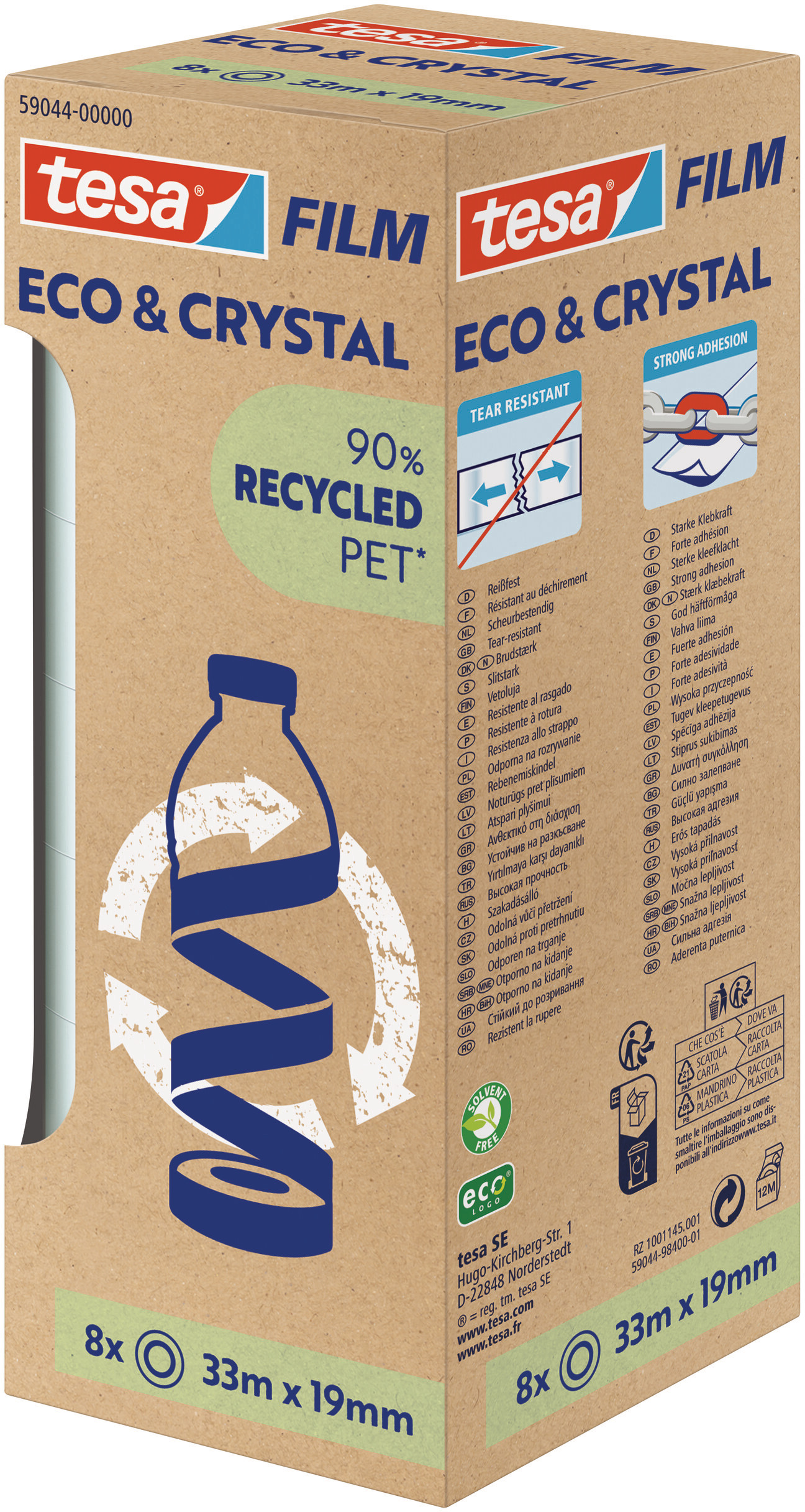 tesafilm® eco & crystal Klebeband - transparenter Klebefilm aus wiederverwertetem PET-Material - reissfest, mit starker Klebkraft