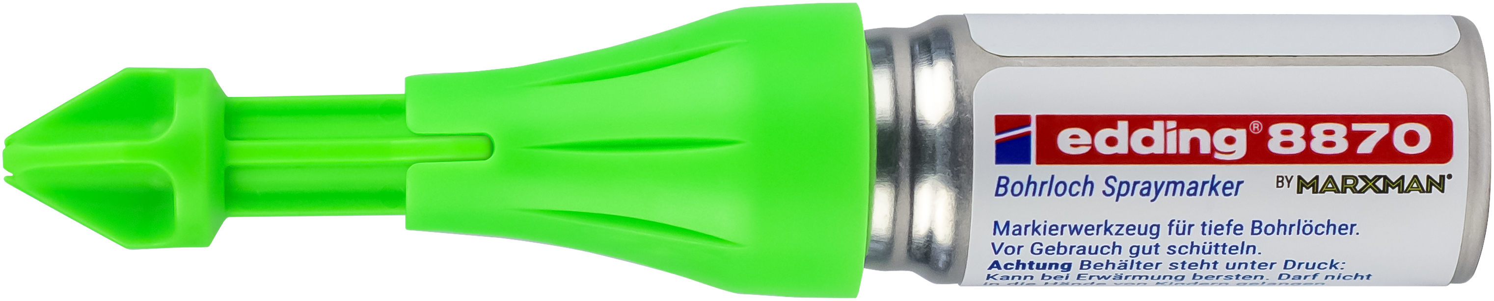 Bohrloch Spraymarker mit patentiertem Pumpmechnismus für nicht permanentes Markieren an schwer zugänglichen Stellen auf fast allen Materialien. Die individuell geformte Spitze des Bohrlochspraymarkers ermöglicht Markierungen durch Bohrlöcher von bis zu 50 mm Tiefe und 3–13 mm Durchmesser. Kann aus jedem Winkel und jeder Höhe verwendet werden, auch über Kopf. Die nicht permanente Kreide ist einfach abwischbar von geschlossenen Oberflächen und ermöglicht so schnelle Korrekturen.