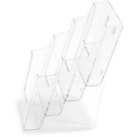 Mehrstufiger Prospekthalter für eine Vielzahl von Prospekten, spart wertvolle Standfläche. Abgeschrägt, für eine stabile Präsentation. So haben Sie Prospekte und Kataloge glasklar im Blickfeld. Wandmontage ebenfalls möglich. Material: Polystyrol