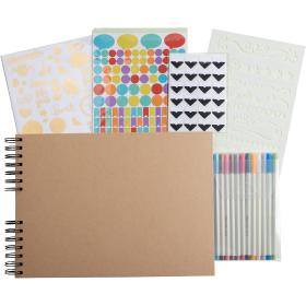 Exacompta, Set Scrapbooking, Album 32x22cm, Kraft, Scrap' Addict Entdecken Sie unser komplettes ScrapAddict Scrapbooking-Set mit einem hochwertigen Kraftspiralalbum und allen Materialien, die Sie benötigen, um Ihre Erinnerungen künstlerisch zu verewigen und Ihrer Kreativität freien Lauf zu lassen. Dieses Set besteht aus: Spiralalbum Kraft mit schwarzen Spiralen 32x22cm mit 70 Seiten aus hochwertigem, in Frankreich hergestellten und ökologisch zertifizierten Papier. Mit einer Gesamtkapazität von 210 Fotos im Format 10x15cm, das eine hervorragende Aufbewahrung der Fotos und einen sehr guten Schreibkomfort gewährleistet. 12 farbige Filzstifte mit Metallic-Tinte, die speziell für das Schreiben auf schwarzem Papier entwickelt wurden. Zwei Stickerbogen mit klassischen pastellfarbenen Motiven und zwei Stickerbogen mit originellen und trendigen goldfarbenen Motiven, insgesamt 300 Sticker. Zwei Stickerbogen mit klassischen, pastellfarbenen Motiven und zwei Bogen mit originellen, trendigen goldfarbenen Stickern. Insgesamt 300 Sticker. Ein Set aus zwei Schablonen mit einem Bogen mit geometrischen Motiven und einem Bogen mit Kindermotiven + ein Set aus zwei Bögen mit kraft- und schwarzfarbigen Fotoecken. Insgesamt 48 Teile.