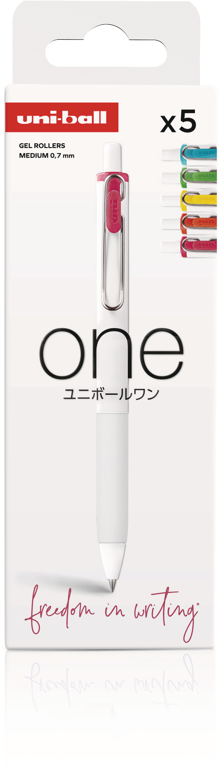 Der Gelschreiber, den Sie nicht mehr aus den Händen geben werden! Mit dem uni-ball One können Sie in aller Freiheit schreiben. Der praktische Metallclip in Form einer Büroklammer lässt sich überall befestigen und ist der perfekte Begleiter für den Tag. Sein minimalistisch-schlichtes Design gewann den Preis des internationalen Designwettbewerbs IF DESIGN AWARD 2021. So macht Schreiben wieder Spas. Mit den originellen, lebhaften und leuchtenden Farben bringen Sie Farbe in Ihre Texte! Die Gel-Tinte des ONE ist licht-, wasser- und wetterbeständig und bleibt der Qualität von uni-ball treu. Die 0,7 mm Spitze ermöglicht ein sanftes Schreiben. Kartonetui mit 5 farblich sortierten Farben: Himmelblau, Hellgrün, Gelb, Mandarinorange, Pink