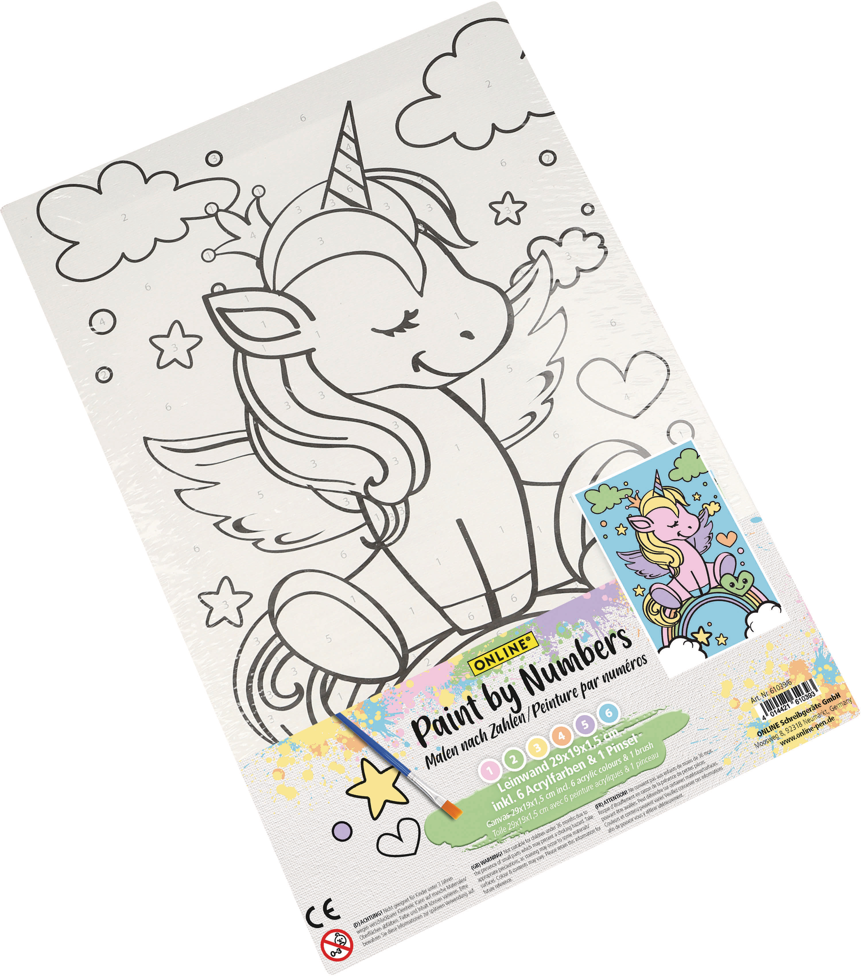 Paint by numbers Set inkl. Pinsel & 6 Acrylfarben, "Malen nach Zahlen", 1 Leinwand 29x19x1,5cm inkl. Motiv zum Bemalen