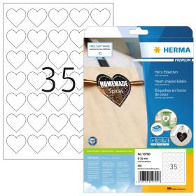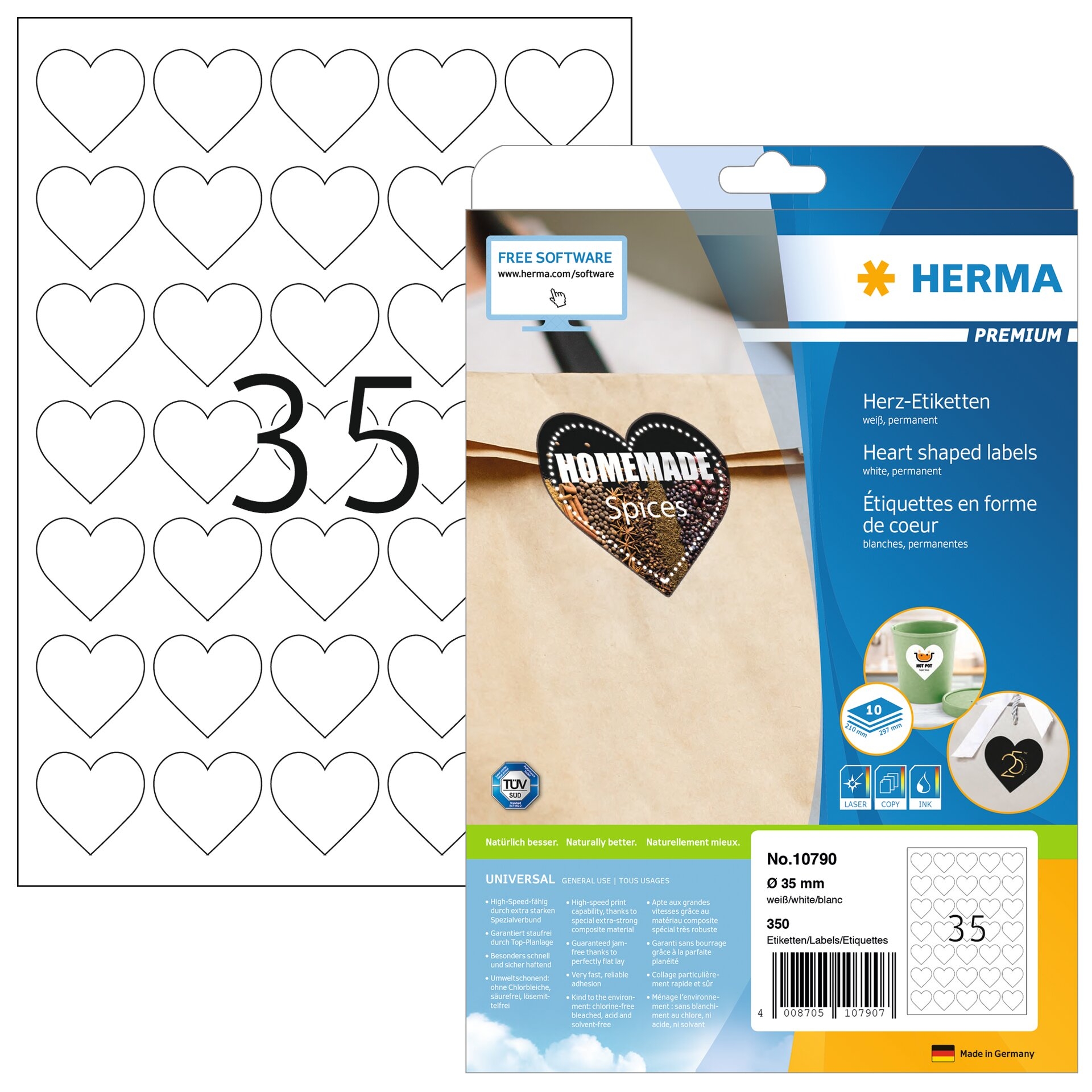 HERMA 10790 Herz-Etiketten DIN A4 (Ø 35 mm, 10 Blatt, Papier, matt) selbstklebend, bedruckbar, permanent haftende Herzaufkleber, 350 Klebeetiketten, weiss