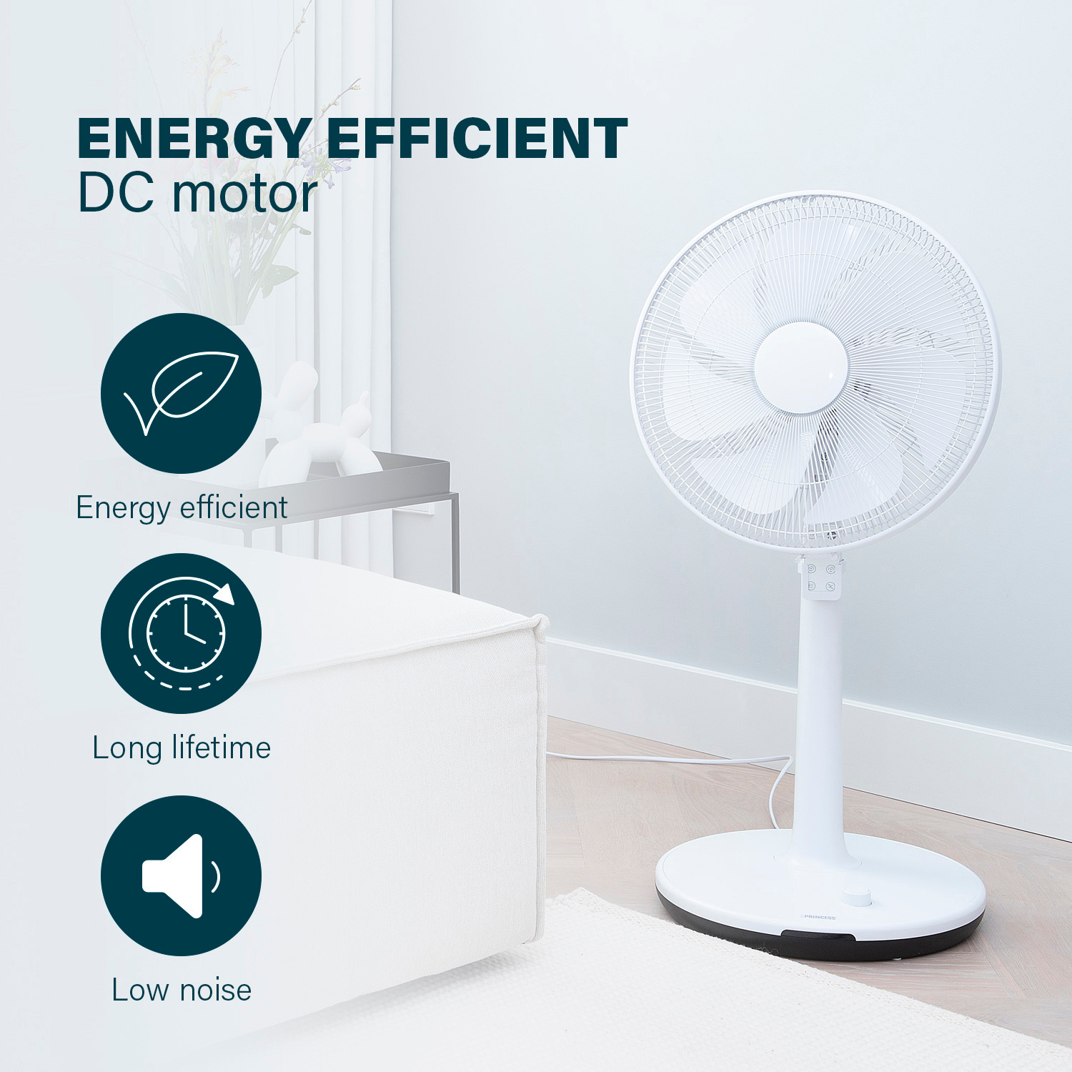 Der Princess 358450 Smart DC Standventilator ist eine leistungsstarke und effiziente Kühllösung, die eine unglaubliche Bandbreite von 24 Geschwindigkeitsstufen (300 - 1050 U/min) bietet, um Ihren Komfort zu erhöhen. Dank der mitgelieferten Timer-Funktion und der Fernbedienung ist die Bedienung dieses Bodenventilators ein Kinderspiel. Ganz gleich, ob Sie eine sanfte Brise oder einen kräftigen Luftstrom bevorzugen, dieser Ventilator ist immer das Richtige für Sie. Darüber hinaus bietet er vier Belüftungsmodi: normal, natürlich, Schlaf und intelligent, um Ihren ganz speziellen Bedürfnissen gerecht zu werden.