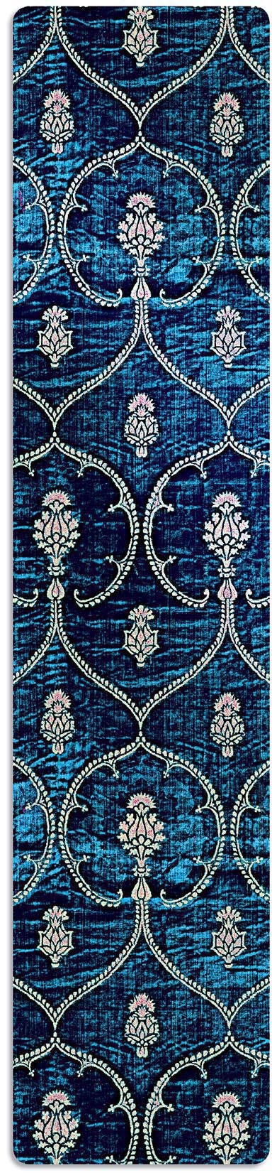 Unser Motiv Samtblau geht auf eine Samtdalmatik aus dem 15. Jahrhundert zurück. Sie wurde mit einem Goldfaden durchwirkt und zeigt ein siebenbogiges Wappen mit einem botanischen Symbol in Form einer Artischocke und winzigen Blumenmustern.