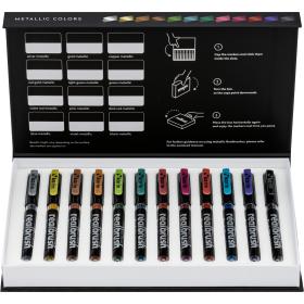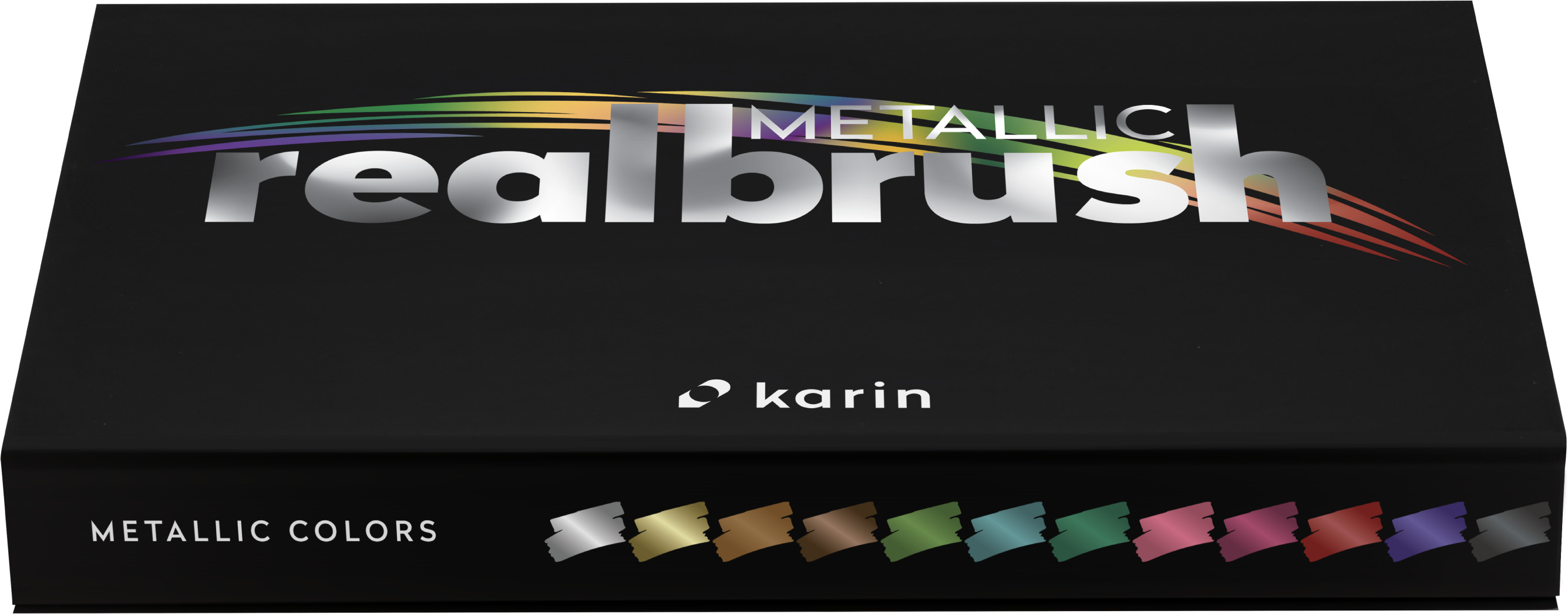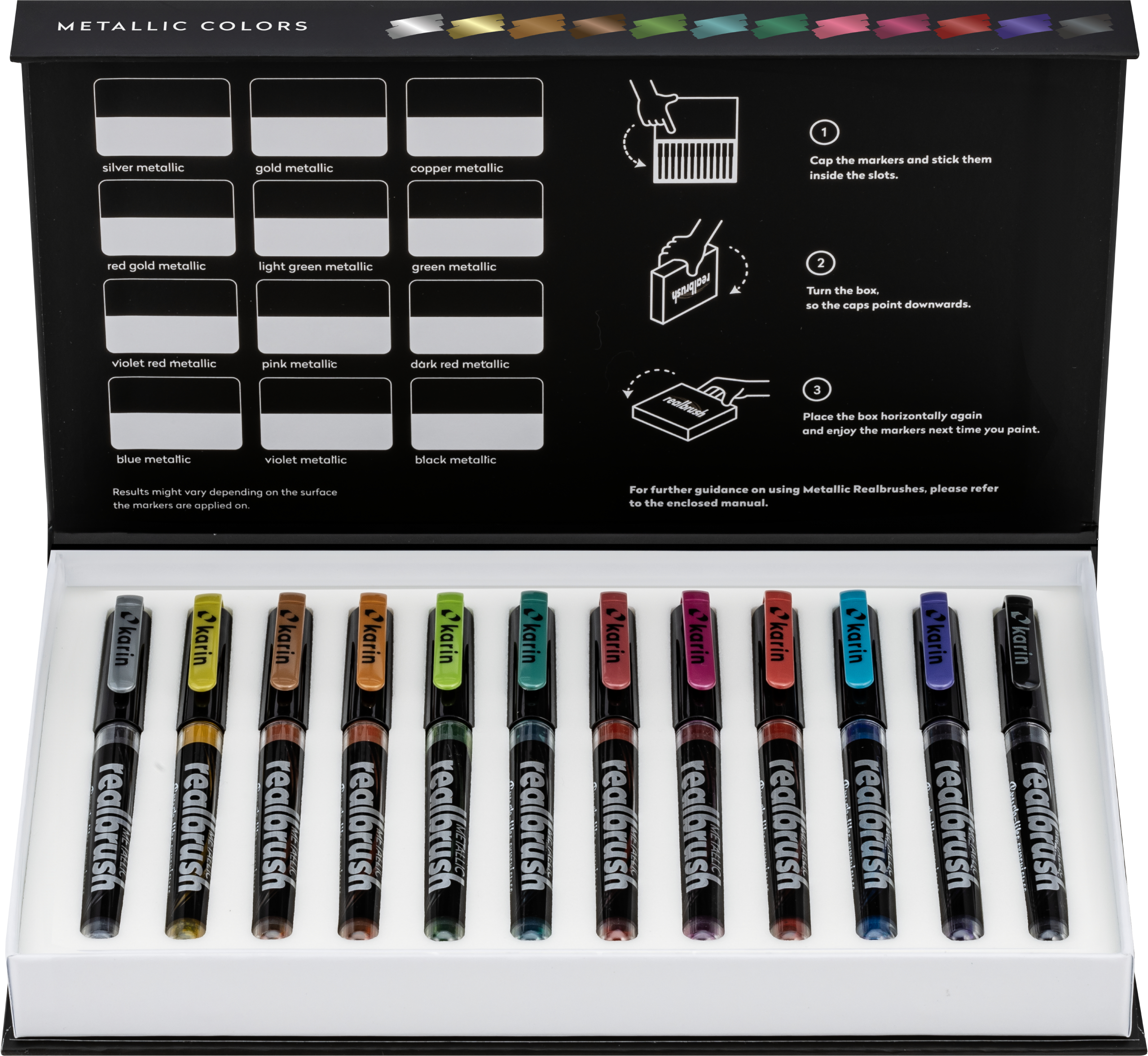 REAL BRUSH METALLIC sind in einem Markergehäuse eingeschlossene moderne Pinsel (sog. real brush Marker). Sie enthalten 2,4 ml ungiftige Farbe auf Basis von Metallpigmenten. Sie decken sowohl schwarze als auch weisse Oberflächen perfekt ab. Nach dem Trocknen ist die Metallic-Farbe auf Oberflächen wie Papier, Holz, Keramik, Glas, Metall und Kunststoffen dauerhaft, lichtbeständig und wasserfest. Dekorationen und Zeichnungen, die mit REAL BRUSH METALLIC Pinsel erstellt wurden, sind langlebig und verblassen nicht. Sie wurden mit der „Free Ink“-Technologie hergestellt die Verwendung von 100 % der darin enthaltenen Farbe ermöglicht. Pinselgrösse: 4 mm.