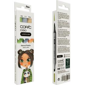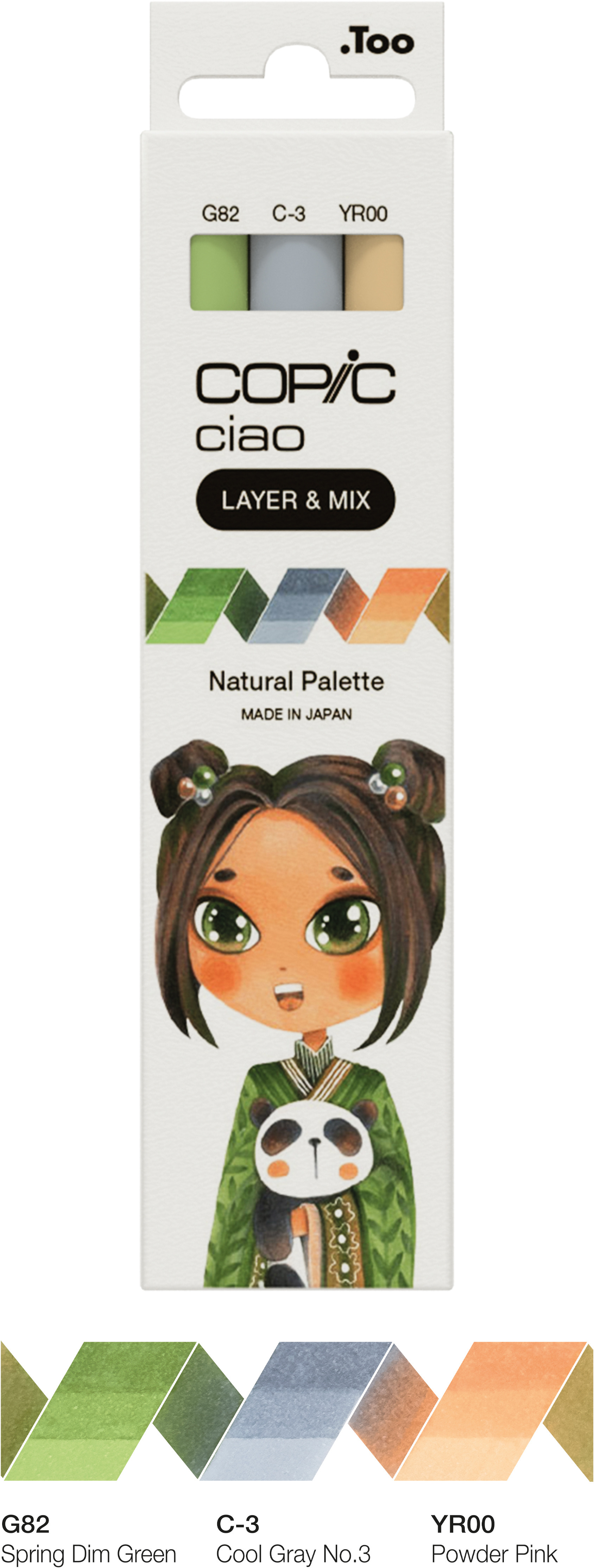 Neue, faszinierende Sets, die eine grosse Palette beliebter Themen für ein breites Einsteigerpublikum bieten. Mit den user-freundlichen Copic Ciao-Minipaletten LAYER & MIX kannst du deine Copic-Reise ganz einfach, kostengünstig und benutzerfreundlich starten. Jedes Set beinhaltet nur 3 Farben, mit denen du durch Übereinanderlegen und Mischen insgesamt 12 Farbtöne kreieren kannst. Die abgebildeten Farbmuster und Illustrationen auf den Verpackungen geben einen inspirierenden Einblick in das Potenzial der Möglichkeiten, die du mit dem LAYER & MIX-Konzept erzielen kannst. Die Sets eignen sich auch hervorragend zum Sammeln, da sie jeweils einzigartige Farbkombinationen ohne Duplikate enthalten. Natural Palette. Enthaltene Farben: C-3 (Cool Gray No. 3), G-82 (Spring Dim Green), YR-00 (Powder Pink)