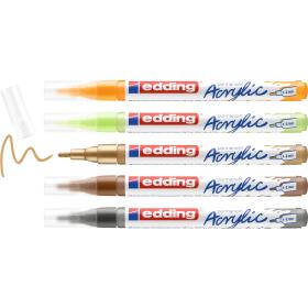 Acrylmarker zum Malen auf hellen oder dunklen Oberflächen, ideal für Materialien wie Leinwand, Malpapier, Holz, Stein oder Terrakotta. Die runde Feder hat eine Strichbreite von 1-2 mm. Die hochwertig pigmentierte Acrylfarbe auf Wasserbasis ist deckend, lichtecht, geruchsneutral und nach dem Trocknen permanent. Das Set enthält die Farben Sonnengelb, Pastellgrün, Haselnuss, Reichgold und Anthrazit. Passende Ersatzpitzen (edding 5300 Ersatzspitzen) sind erhältlich. Nach der Trocknungszeit wetterfest.