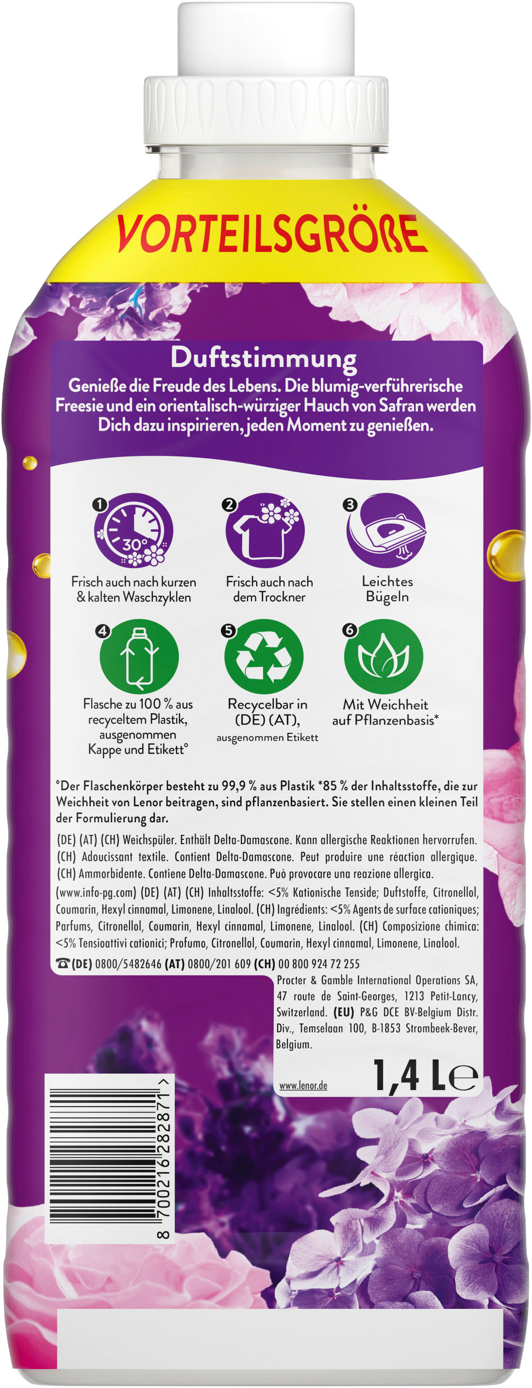 Lenor Blütentraum Weichspüler für ein 24 Stunden Wohlfühlfrische mit einer Note von ätherischen Ölen. Die blumigen Noten von verführerischer Freesie, kombiniert mit einem orientalisch-würzigen Hauch von Safran – eine Inspiration, jeden Moment zu geniessen. Für maximale Freude beim Waschen, probiere den Lenor Weichspüler zusammen mit dem Lenor Color Waschmittel und Wäscheparfüm Amethyst Blütentraum aus – alle sind perfekt aufeinander abgestimmt und sorgt für unwiderstehliche Wohlfühlfrische.