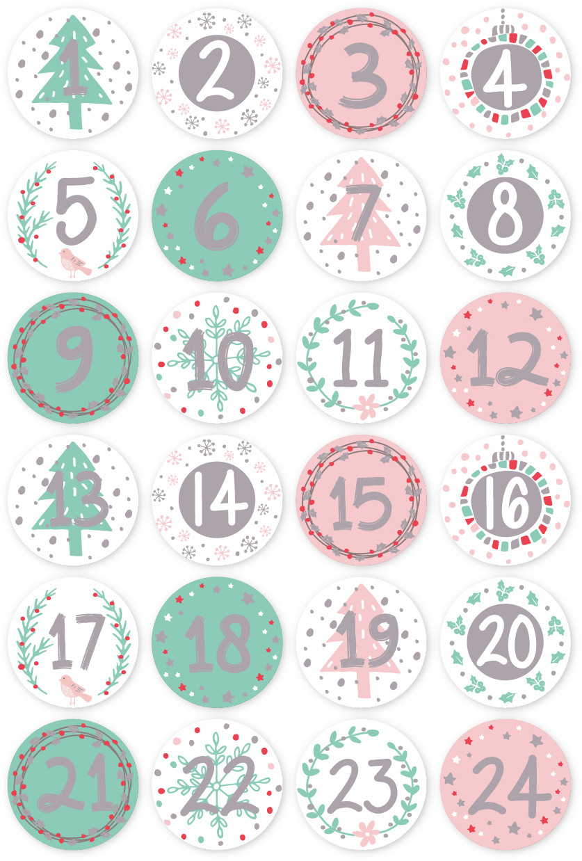 Auf 4 Blätter sind insgesamt 24 Sticker mit einem Durchmesser von 4 cm. Die unterschiedlichen Sticker eignen sich perfekt, um einen selbst gebastelten Adventskalender zu nummerieren. Du kannst sie auch mit weiteren Produkten wie Washi Tapes oder Streuteile für eine zauberhafte Verzierung kombinieren.