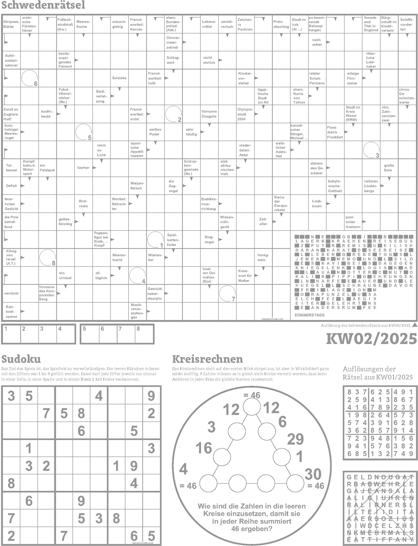 53 Wochenblätter mit Eintragekalendarium. Rückseiten mit Kreuzworträtseln, Sudokus und mehr.