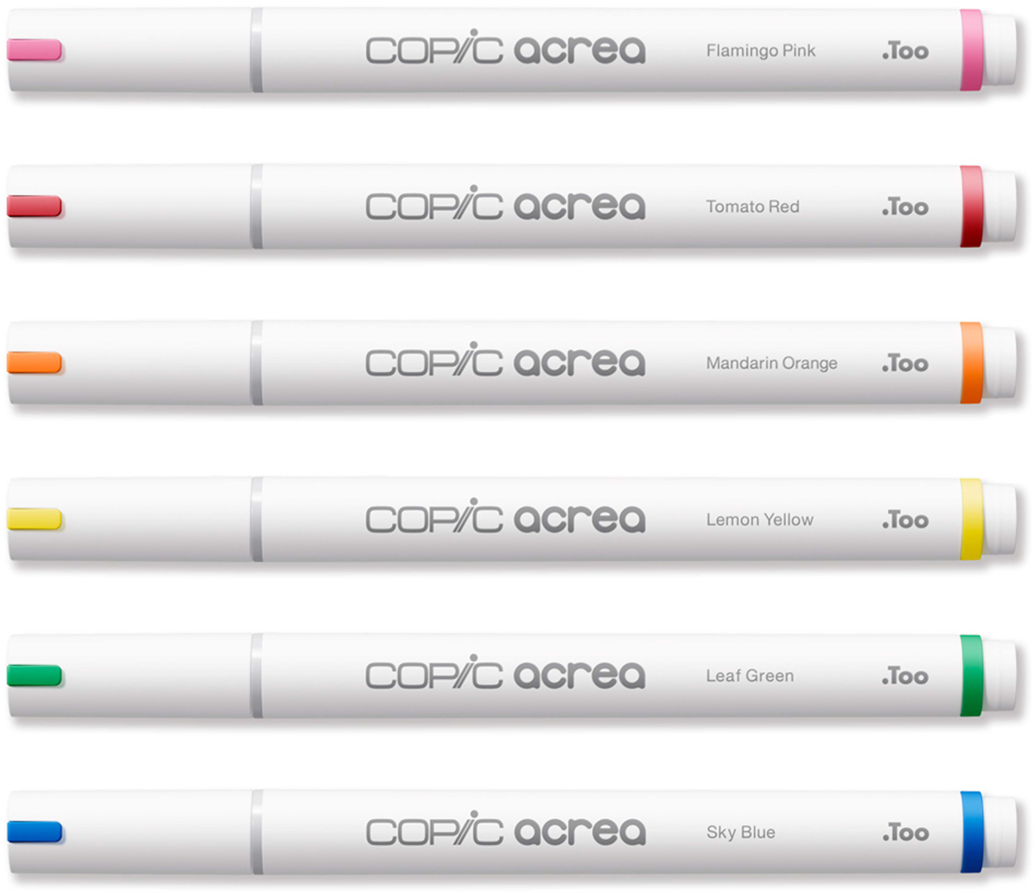 Copic Acrea bietet eine unverwechselbare Auswahl an Wasser- und und pigmentbasierten Markern mit 24 deckenden Farbtönen die von Schneeweiss bis zu saftigen Pastelltönen und glänzenden Metallic. Die Marker Tinten sind wasserfest, ungiftig und geruchsneutral.