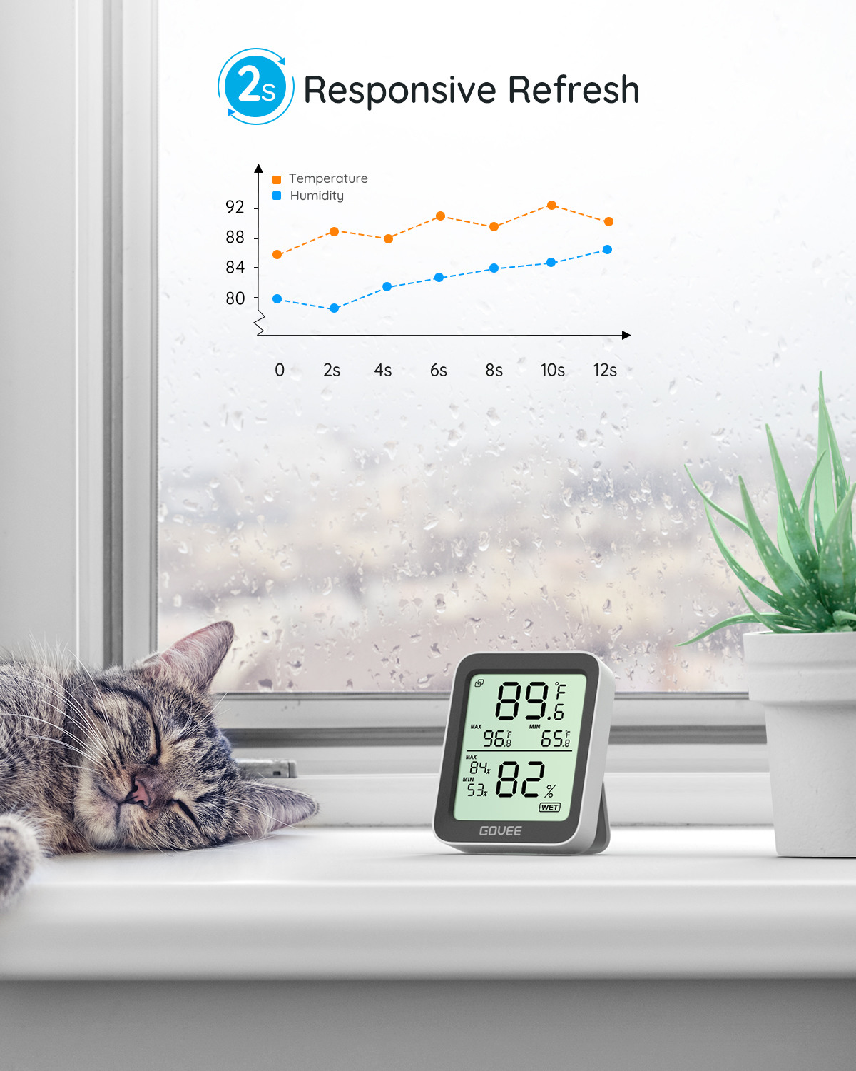 Das intelligente Bluetooth Thermometer-Hygrometer H5075 von Govee überwacht die Temperatur und Luftfeuchtigkeit in jedem Innenraum, und sorgt für ein gesundes und komfortables Wohnumfeld. Es bietet intelligente Funktionen wie Fernüberwachung und Temperatur-Feuchtigkeitsdiagramme. Das Feuchtigkeitsmessgerät ist zuverlässig und einfach zu verwenden für Häuser, Gewächshäuser und mehr. Mit dem in der Schweiz hergestellten intelligenten Hygrometersensor ist die Temperatur bis auf ±0,32°C genau, während die Luftfeuchtigkeit ±3 % RH beträgt. Der Raumfeuchtigkeitsmesser ist mit einem hellen 3" LCD-Bildschirm mit grossen Zahlen leicht abzulesen. Über die intelligenten App-Benachrichtigungen erkennt man sofort, wenn Voreinstellungen ausserhalb des Bereichs liegen, auch wenn man sich gerade nicht in der Nähe des Geräts befindet. Die 20 Tage Kurvendiagramme bieten einen klaren Überblick über Datenänderungen. Die Daten der letzten 2 Jahre können exportiert und in ein CSV-Format konvertiert werden.
