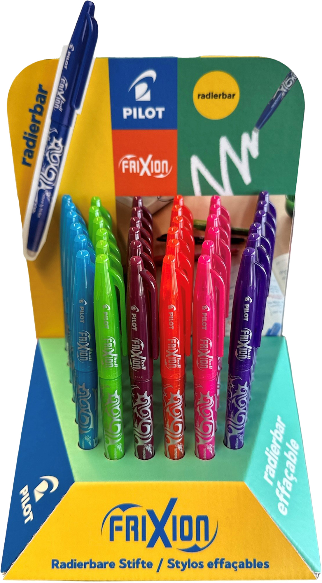 Thekendisplay mit 36 Tintenroller PILOT FriXion Ball in Fancy Farben. Der radierbare FriXion Ball ist ein absoluter Bestseller, der in dem kompakten Kartondisplay perfekt präsentiert wird.