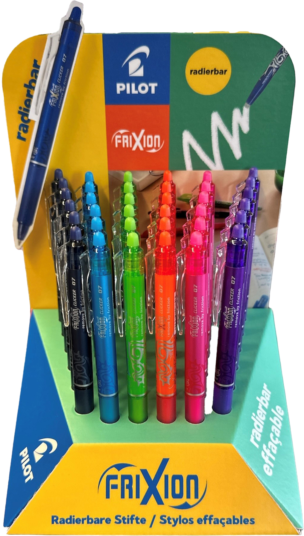 Thekendisplay mit 36 Tintenroller PILOT FriXion Clicker in Fancy Farben. Der radierbare FriXion Clicker ist ein absoluter Bestseller, der in dem kompakten Kartondisplay perfekt präsentiert wird.