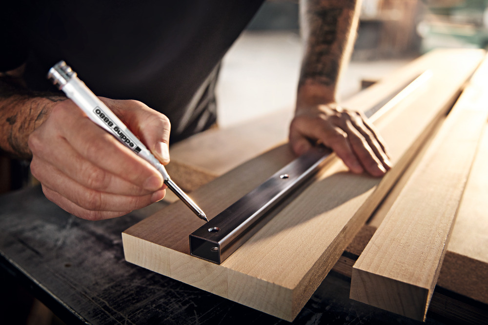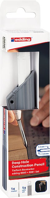 Tiefloch Baumarker im praktischen Holster zum präzisen Markieren auf fast allen Materialien wie Holz, Metall, Kunststoff, Fliesen und Karton. Besonders robuster Aluminiumschaft mit Recyclingmaterial. Durch das lange (42 mm) und dünne (5,5 mm) Mundstück eignet sich der Marker auch für enge oder andere schwer zugängliche Stellen, z. B. Bohrlöcher oder Schnittkanten. Im Holster integrierter Anspitzer zum Anspitzen mit einer Hand. Die auswechselbare Mine hat einen Durchmesser von 2,8 mm. Gebrauchsfertiges Produkt einschließlich Universal-Graphitmine. Nachfüllbar mit edding 8881 Baumarker Nachfüllminen, separat erhältlich (6er-Set) in Graphit und sortierten Farben für verschiedene Oberflächen.