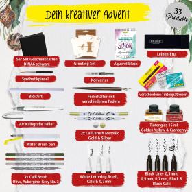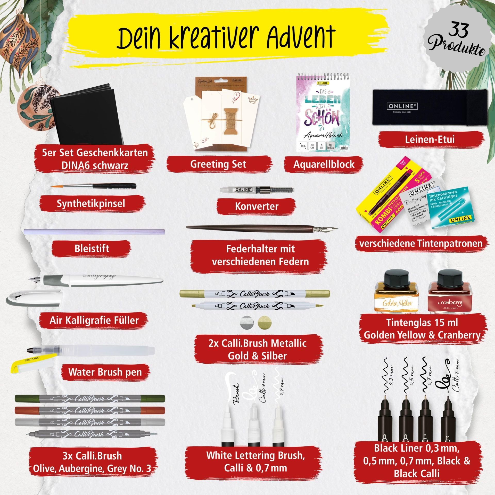 Unser Kalender für Kreative: Für eine kreative Adventszeit braucht man nicht viel – nur den Stifte-Adventskalender von ONLINE. Über 25 Produkte im Wert von über 80 Euro erwarten die ganze Familie, von Groß bis Klein, und schenken jedem Tag Kreativität, Spaß und gemeinsame Zeit. Überrasche Freunde und Familie mit selbstgemachten Weihnachtskarten und entdecke viele weitere Anwendungsbereiche des Letterings. Egal, ob als Geschenk oder als kleine Aufmerksamkeit für den besten Freund oder die beste Freundin – dieser Kalender ist eine hochwertige Überraschung für alle, die gerne zeichnen, schreiben oder künstlerisch tätig sind.